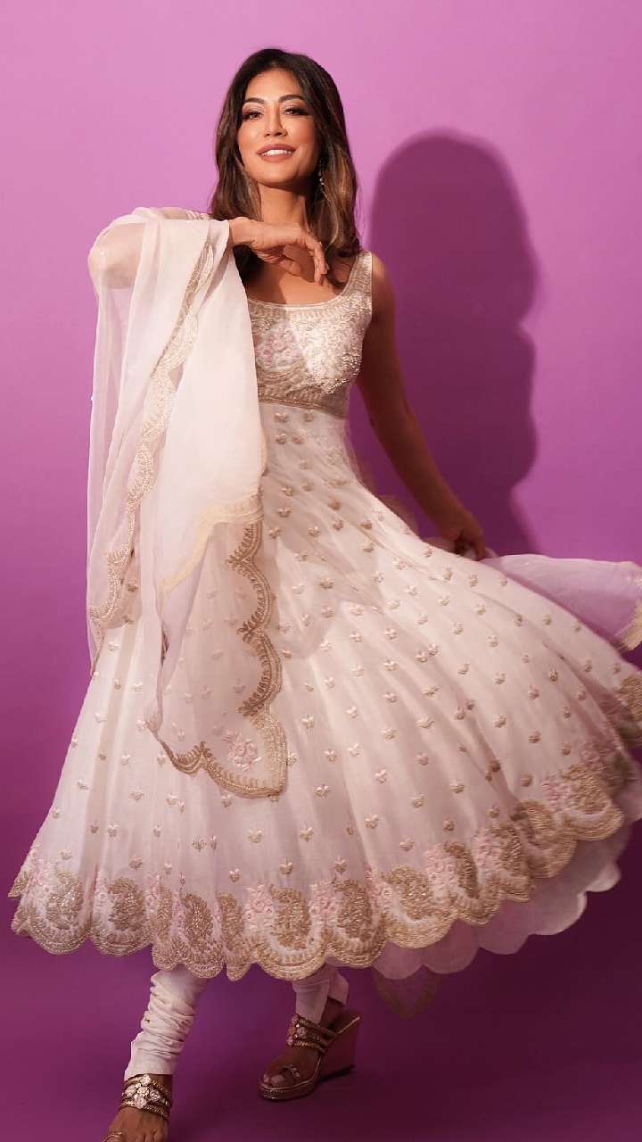 व्हाइट एम्बॉयडरी डिजाइनर अनारकली सूट में एक्ट्रेस बेहद खूबसूरत लग रही है। फंक्शन में हॉट लुक कैरी करने के लिए आप इस सूट को ब्रेड हेयर स्टाइल के साथ कैरी कर सकती हैं।