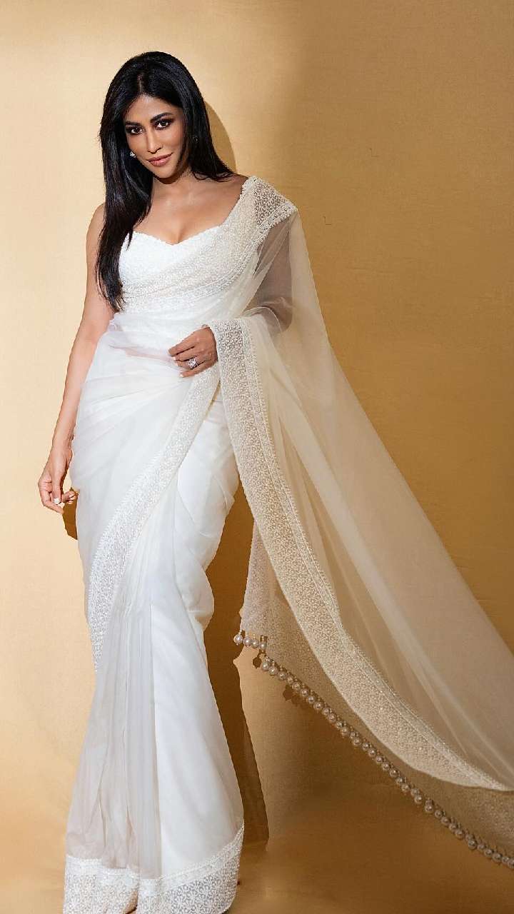 चित्रांगदा सिंह इस व्हाइट कलर की साड़ी में एक्ट्रेस बहुत सुंदर लग रही हैं। प्लेन व्हाइट साड़ी के पल्लू में मोती से वर्क किया गया है।
