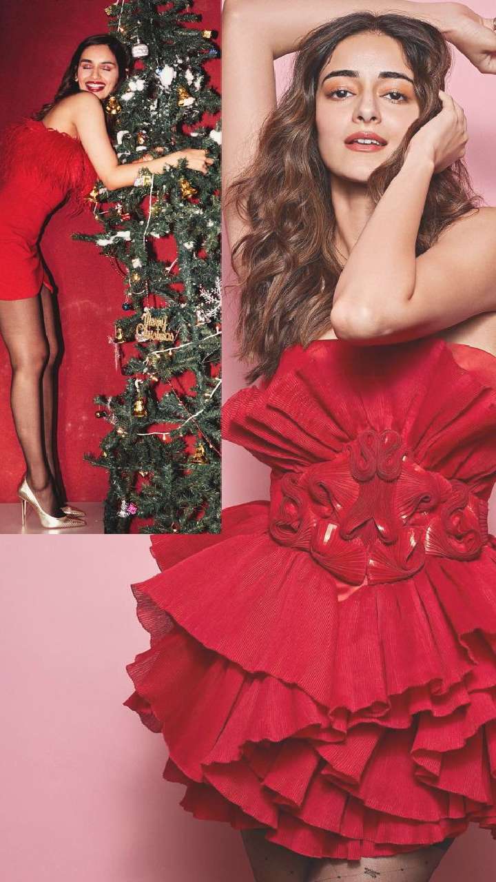 अनन्या का रफल रेड ड्रेस लुक क्रिसमस के लिए बेस्ट ऑप्शन है। ये आपके पार्टी लुक को बोल्ड बना देगा।