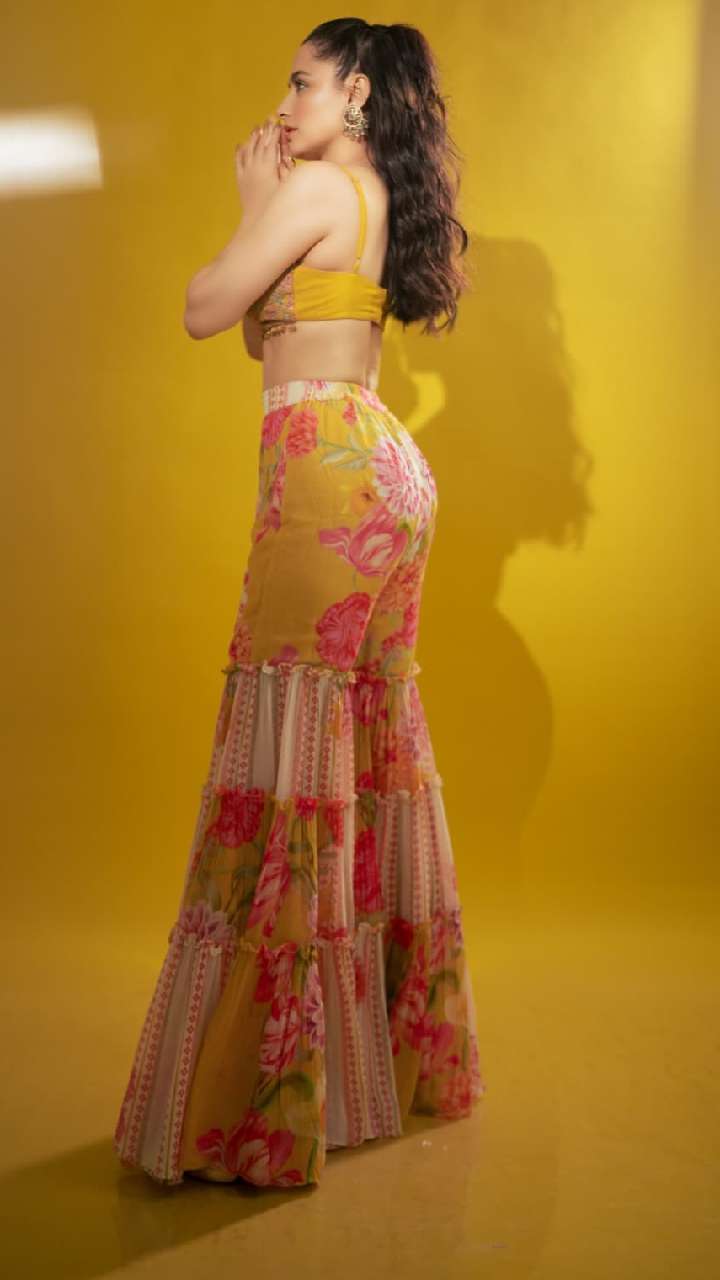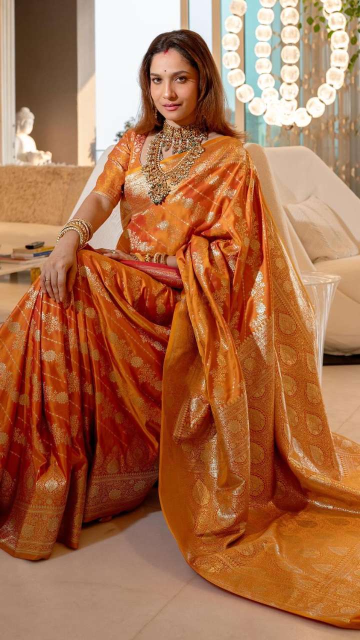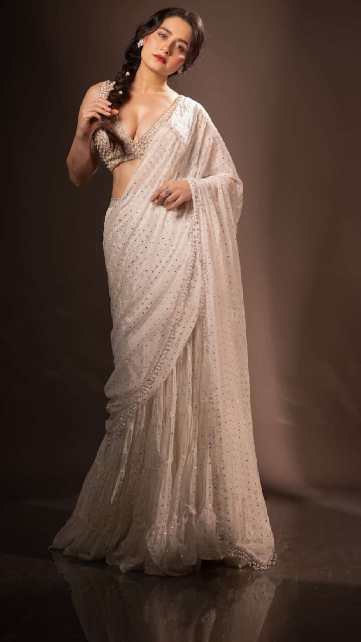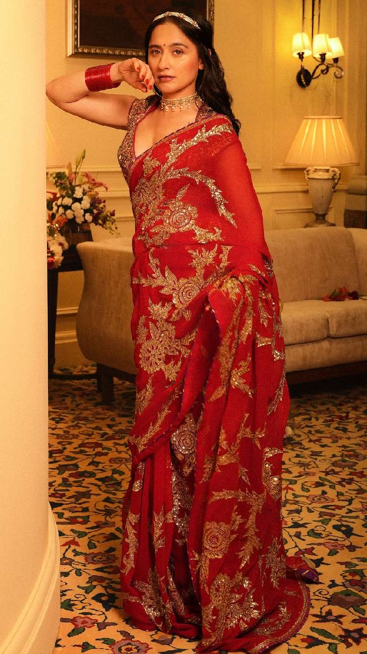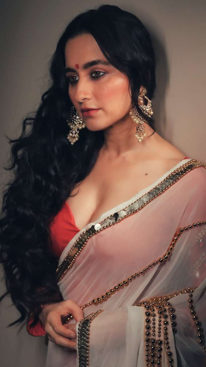 एक्ट्रेस के लंबे बालों में गहरे और सॉफ्ट वेव्स उनके लुक को निखार रहा है। इस ट्रेंडी हेयर स्टाइल को आप ऑफिस की किसी भी पार्टी में साड़ी के साथ कैरी कर सकती हैं। उनका यह लुक एकदम रॉयल और फैशनेबल लग रहा है।