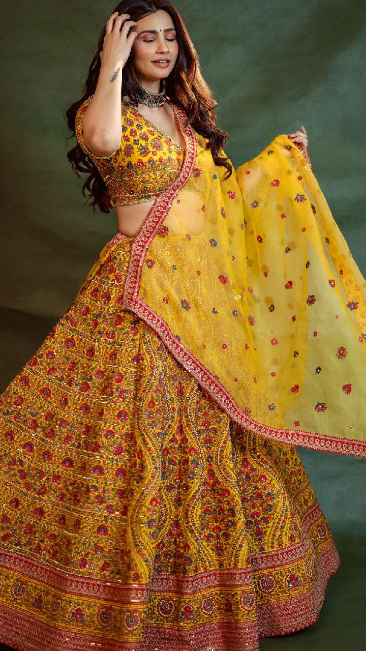एक्ट्रेस येलो कलर के हैवी वर्क लहंगा में अप्सरा जैसी लग रही हैं। उनका यह लुक एकदम बेहतरीन है। आप भी उनकी तरह शादी में ऐसा लहंगा कैरी करके शानदार लग सकती हैं।