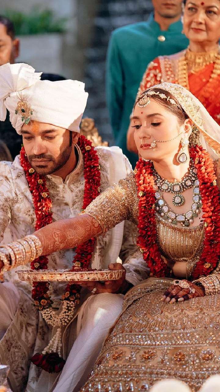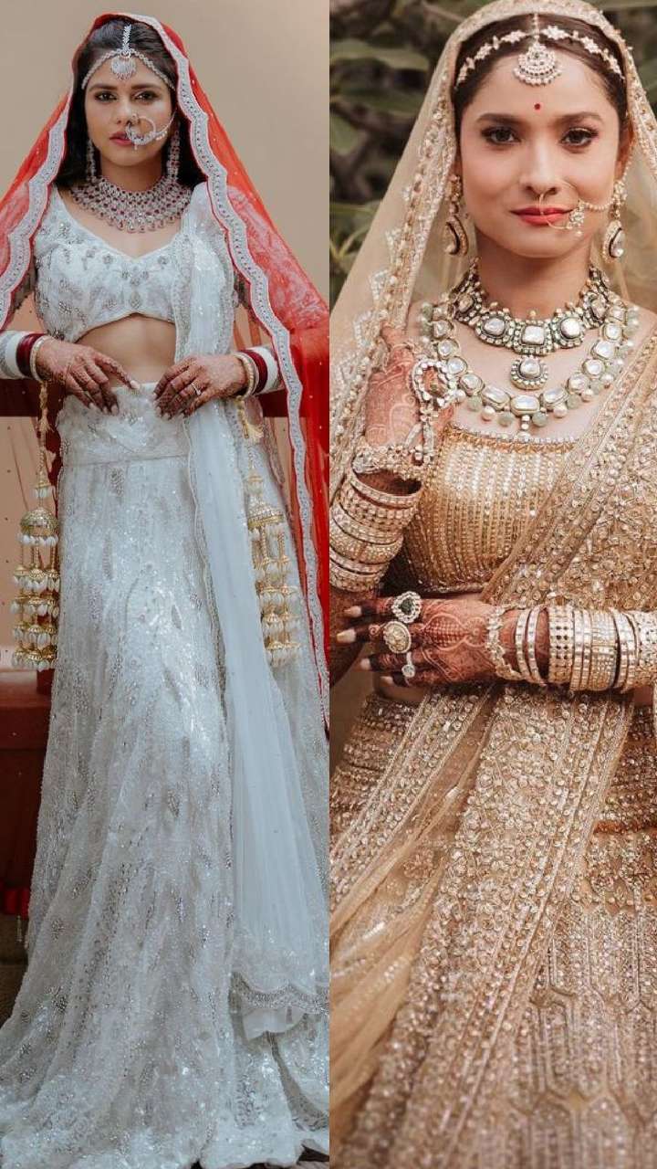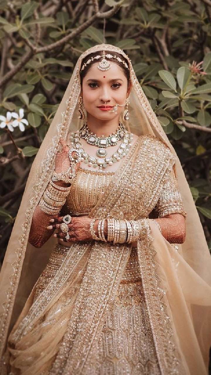 अंकिता लोखंडे अपनी शादी वाले दिन गोल्डन कलर के स्पार्कल लहंगे में रानी लग रही थीं।