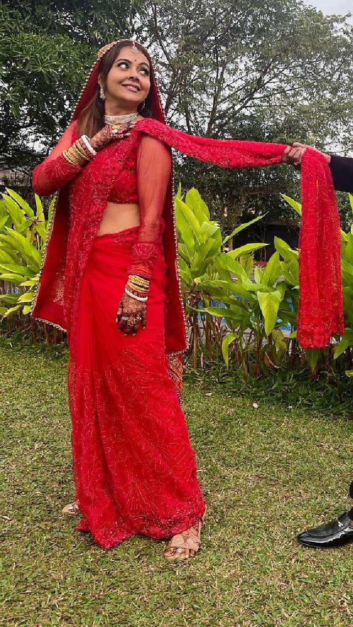 टीवी की गोपी बहू यानि देवोलीना भी लाल साडी में काफी सुंदर लग रही थीं।