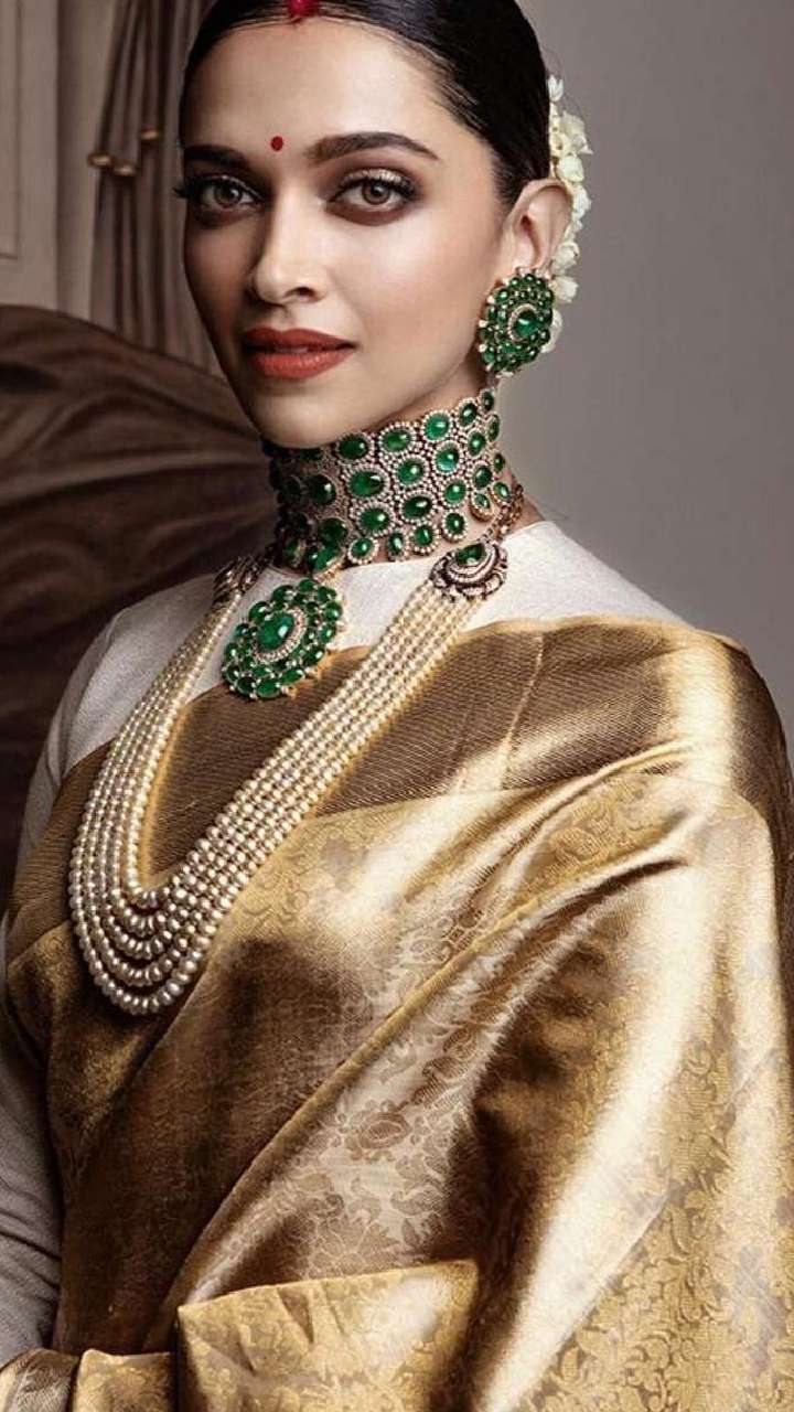 इस गोल्डन डॉट प्रिंट सिल्क साड़ी में आप दीपिका का शाही अंदाज देख सकते हैं। साथ में उनका हेवी ग्रीन स्टोन नेकपीस लाजवाब लुक दे रहा है।