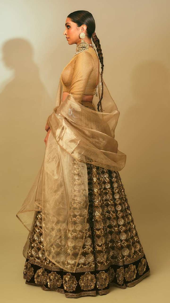 दीपिका ने ब्लैक कलर के लहंगे के साथ गोल्डन प्लेन ब्लाउज कैरी किया है। इस लुक को कंप्लीट करने के लिए दीपिका ने चोटी बनाई है। आप भी अपने भाई की शादी में इसे ट्राई कर सकती हैं।