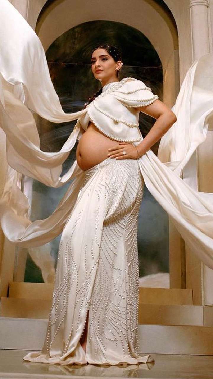 बॉलीवुड की फेमस एक्ट्रेस सोनम कपूर ने भी साड़ी में अपना बेबी बंप फ्लॉन्ट किया था। एक्ट्रेस का ये लुक सोशल मीडिया पर खूब छाया था।