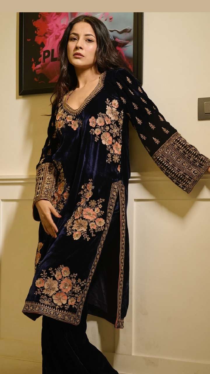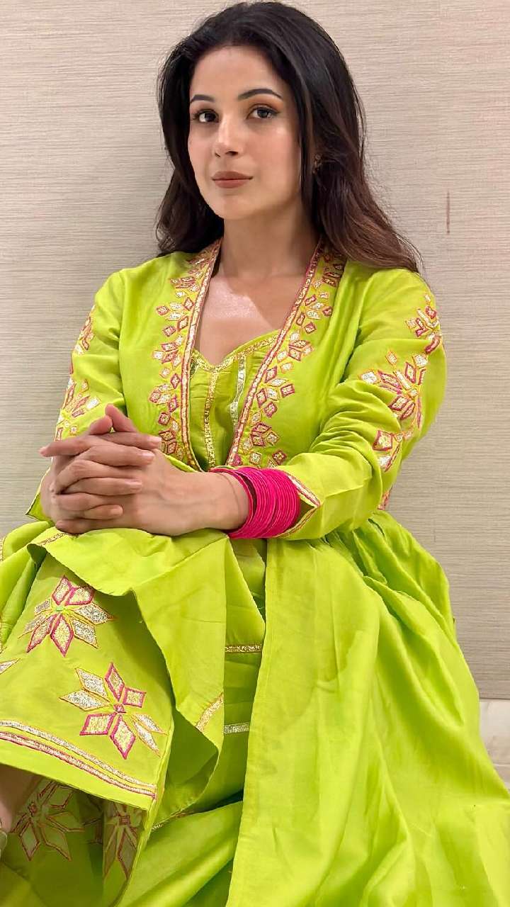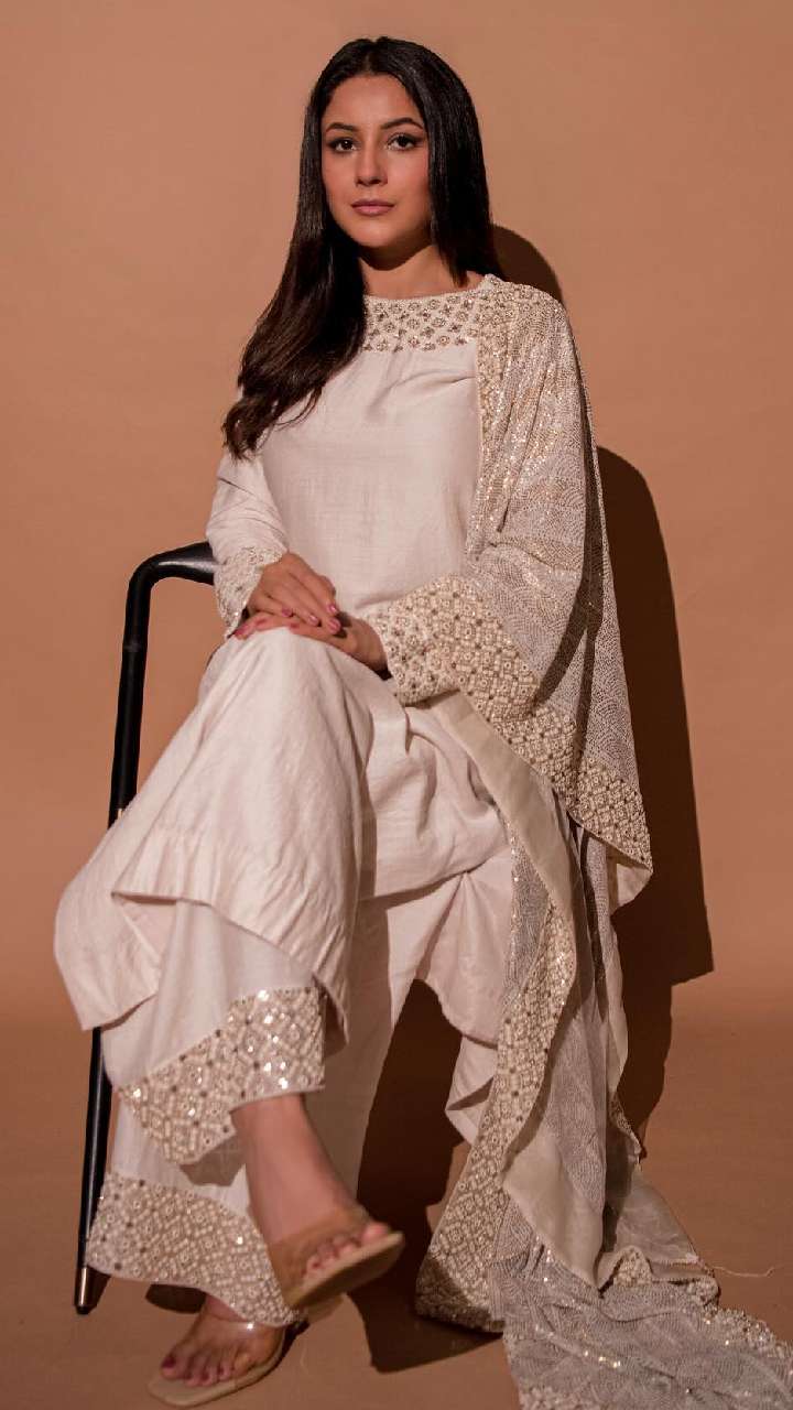 Shehnaaz Gill इस यूनिक स्टाइल वाले सूट में बेहद खूबसूरत लग रही हैं। यंग गर्ल्स टाइट बन हेयर स्टाइल के साथ इस सूट को कैरी कर सकती हैं।