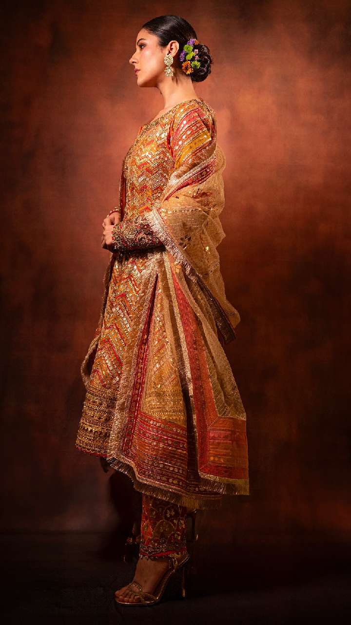 शादियों में पहनने के लिए आप एक्ट्रेस के इस वेलवेट सूट को स्टाइल कर सकती हैं। यह आपके लुक को अट्रैक्टिव और पार्टी में हाइलाइट करेगा।