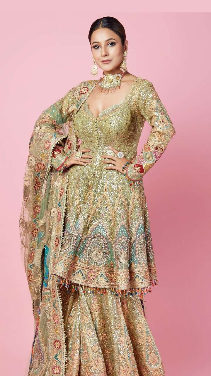 शादियों में आप महारानी जैसा लुक लेने के लिए शहनाज गिल के इस सूट को बोल्ड मेकअप के साथ पहन सकती हैं।
