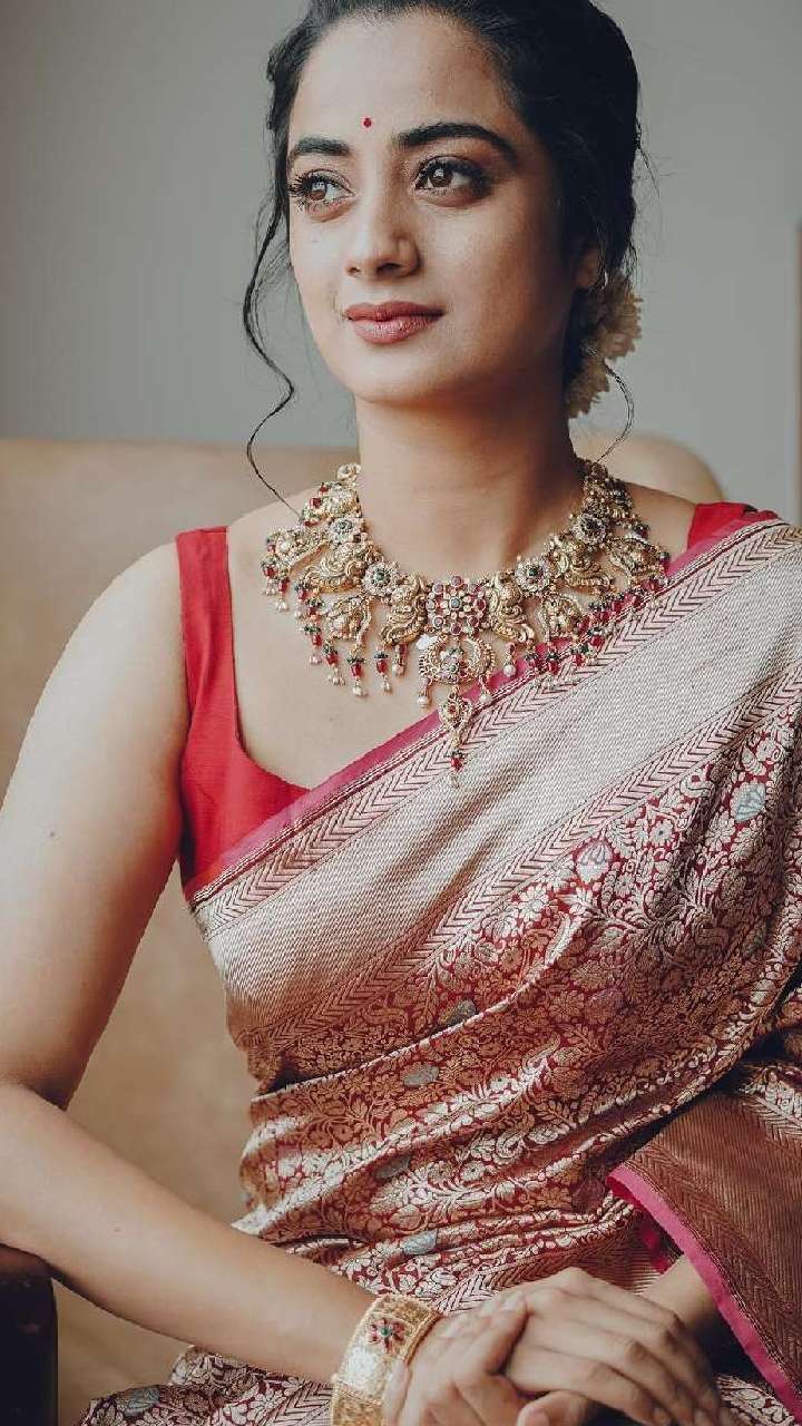 साड़ी को अट्रैक्टिव बनाने के लिए आप मिरर वर्क ब्लाउज को स्टाइल कर सकती हैं। एक्ट्रेस का ब्लाउज देखने में बेहद अट्रैक्टिव लुक दे रहा है।