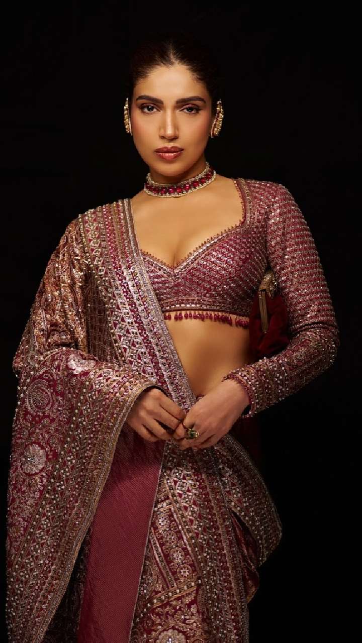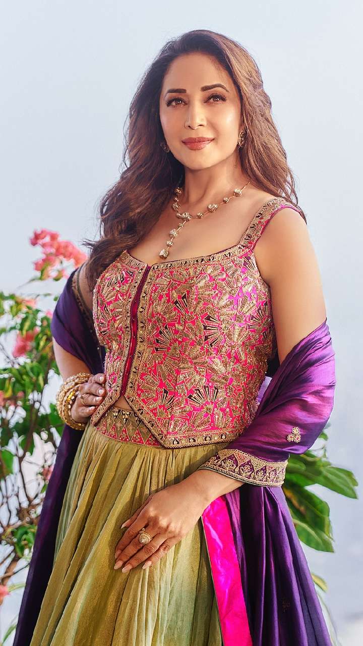 अगर आप साड़ी में पेट छुपाना चाहती हैं, तो माधुरी जैसे कोर्सेट ब्लााउज से आइडिया लें। यह काफी आरामदायक और स्टाइलिश लुक देती हैं।