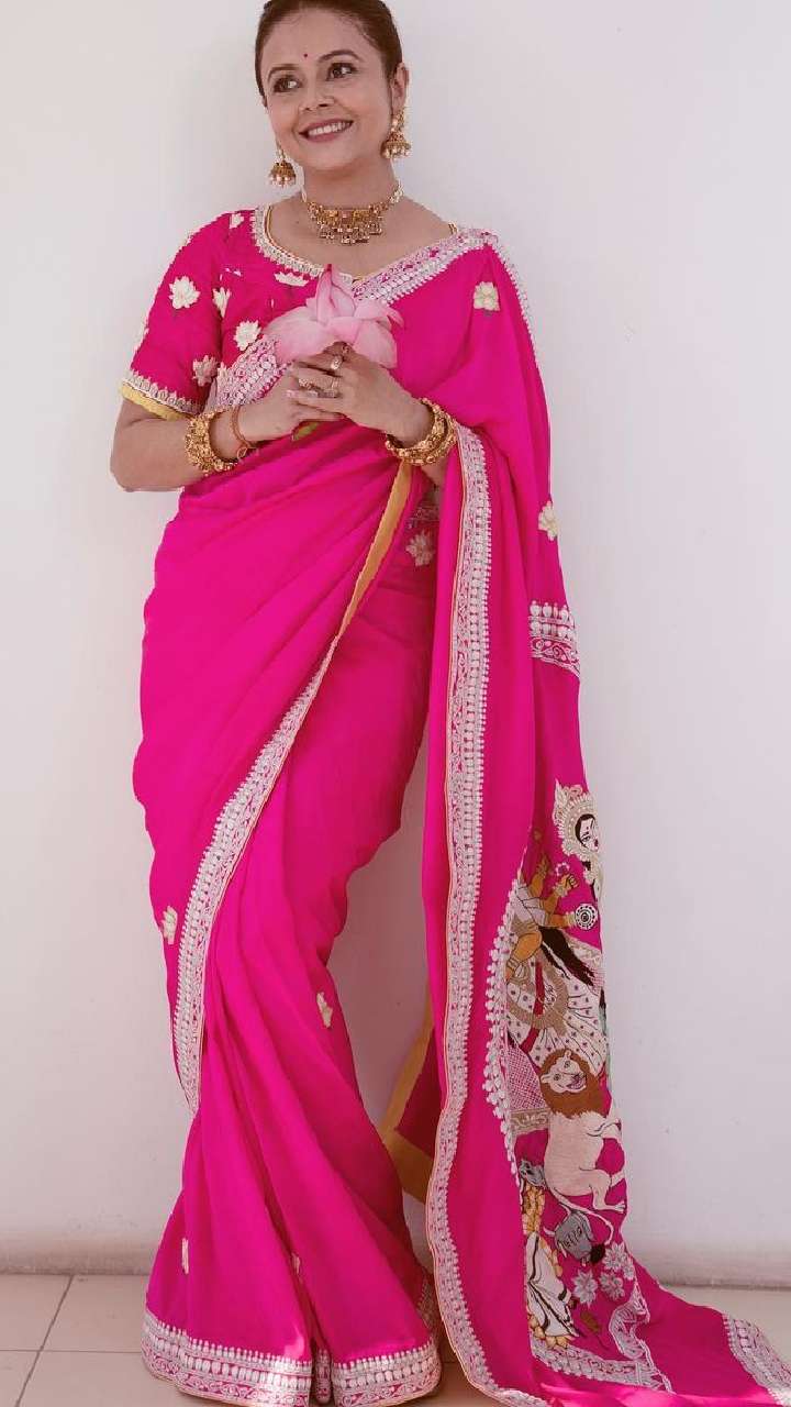 पिंक कलर की इस साड़ी के पल्लू पर एक्ट्रेस ने नौरात्र के लिए स्पेशल वर्क करवाया है।