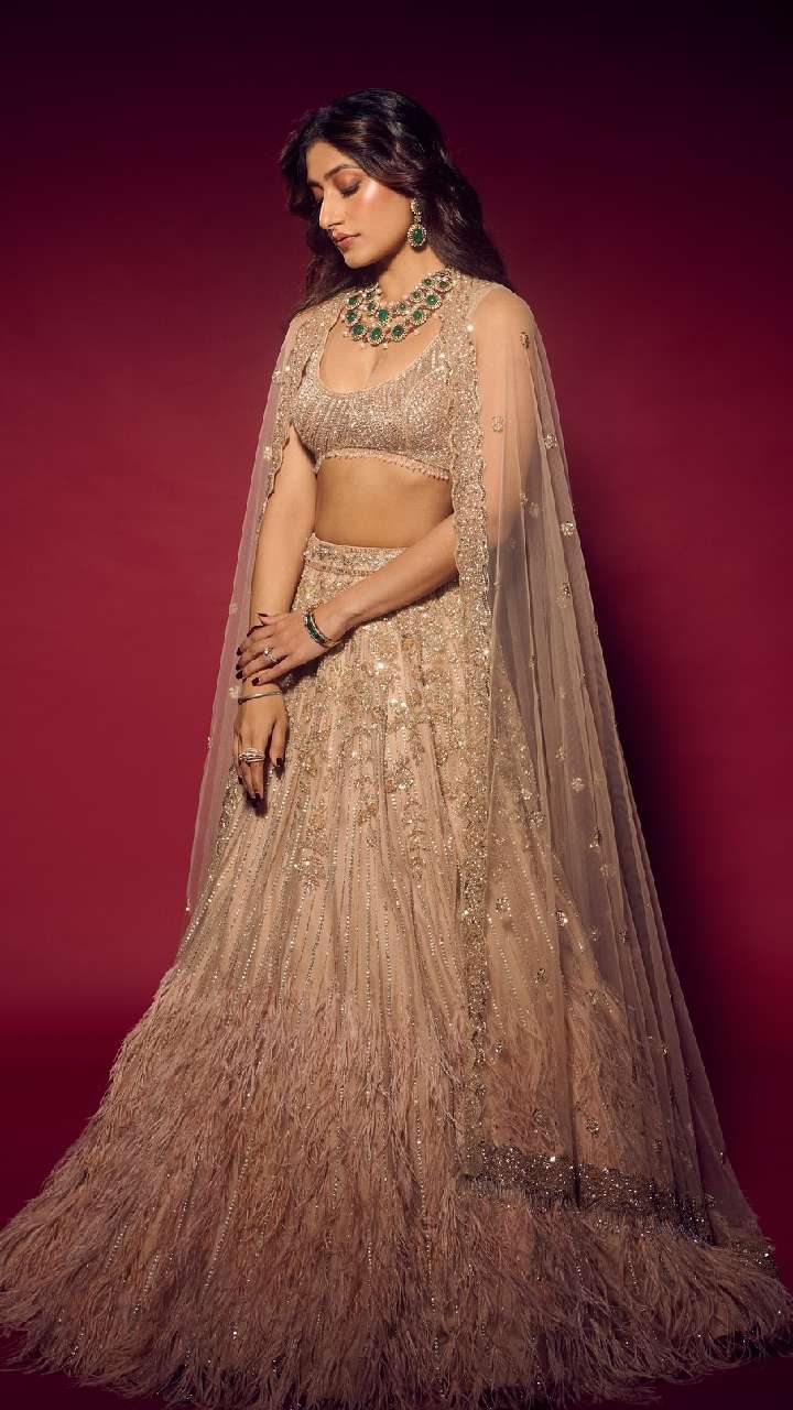 धनश्री वर्मा का ये फेदर हैवी वर्क लहंगा भी काफी ज्यादा शानदार लुक दे रहा है। आप शादी में इस तरह के लहंगे को पहन सकती हैं।