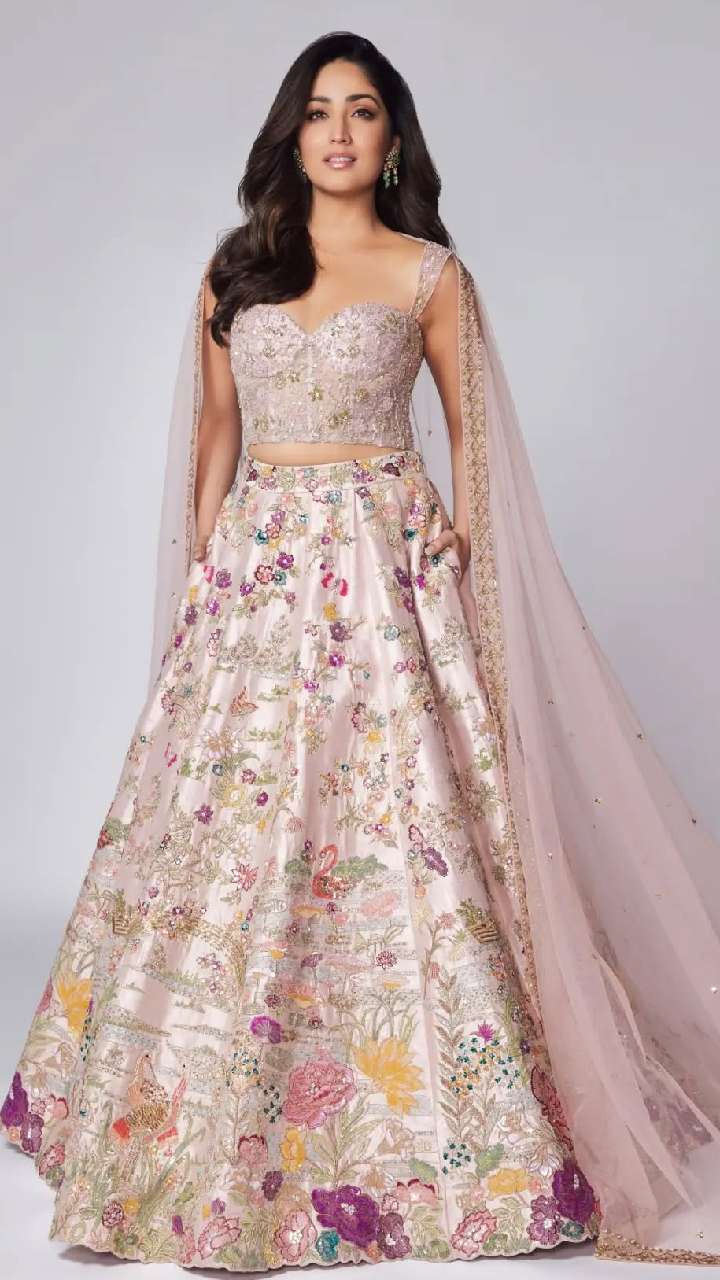 यामी पिंक कलर के हैवी एंब्रॉयडरी लहंगा में अप्सरा जैसी दिखाई दे रही हैं। इसके साथ उन्होंने मैचिंग दुपट्टा कैरी किया है। आप भी ऐसे लहंगा को अपने वॉडरोब में शामिल करें।