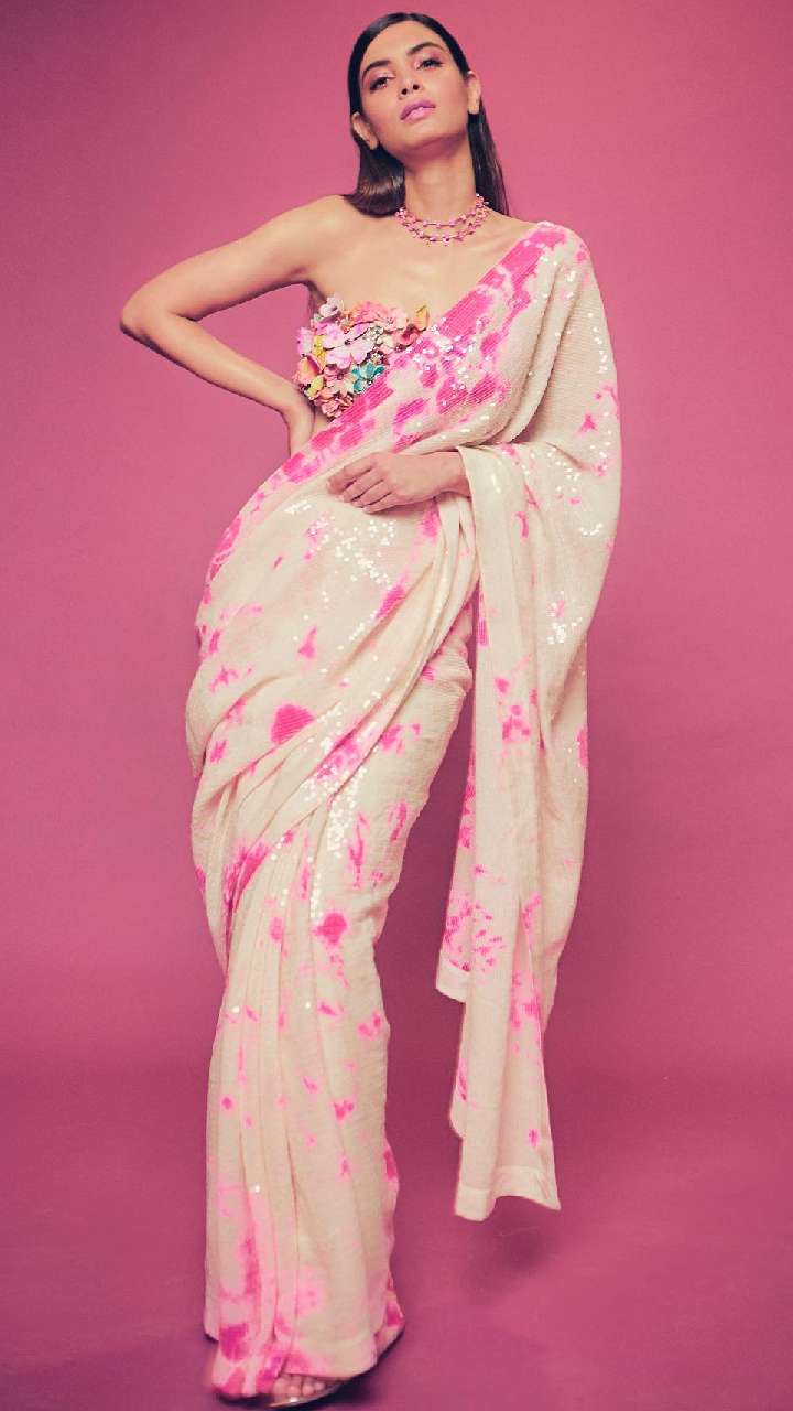 डायना पेंटी की पिंक और व्हाइट कॉम्बिनेशन वाली शिमरी टाई एंड डाई साड़ी स्मार्ट लुक दे रही है। इसके साथ ऑफ शोल्डर ब्लाउज बेस्ट लग रहा है।