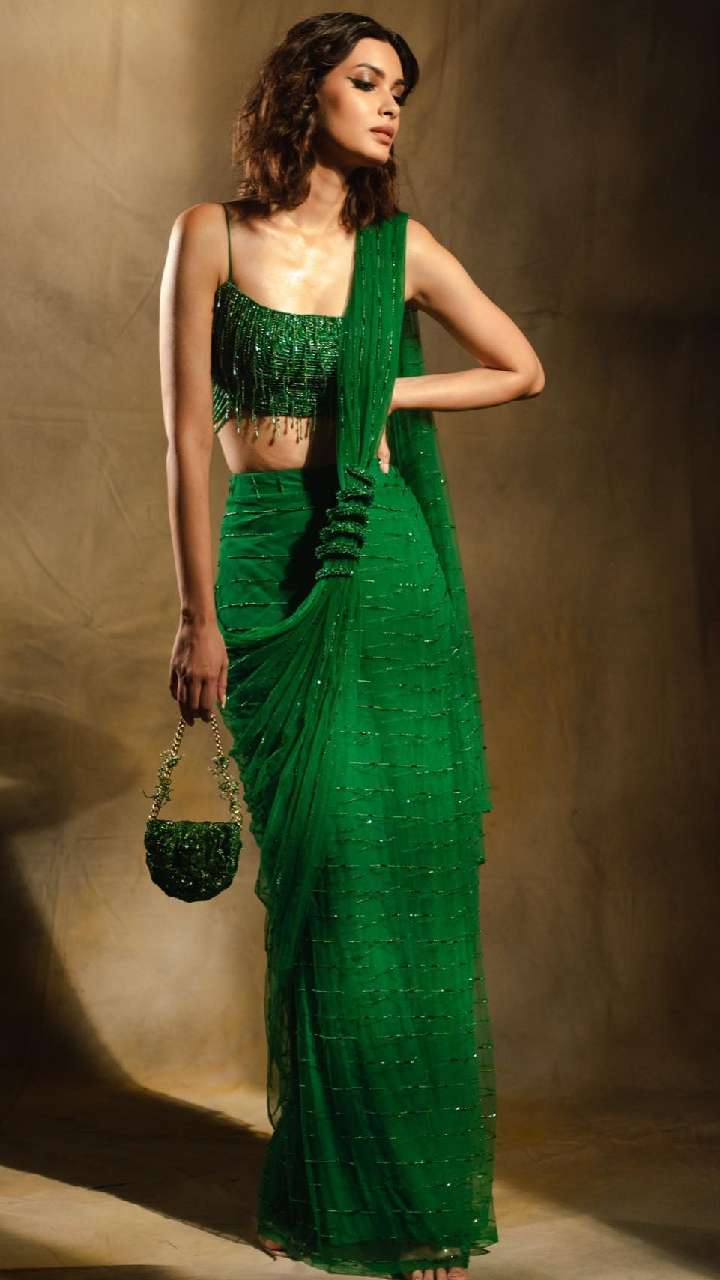 अभिनेत्री की ग्रीन नेटिड साड़ी नूडल स्ट्रैप टसल लेस ब्लाउज संगीत नाइट में आपके लुक में चार चांद लगा देगा। आप भी डीवा की तरह साड़ी ड्रेप करें।