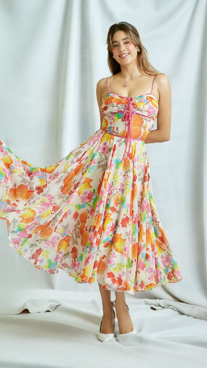 डेट के लिए जाह्नवी कपूर के जैसी प्रिंटेड मिडी ड्रेस को कॉपी कर सकती हैं। यह आपको क्यूट और खूबसूरत लुक देगी।