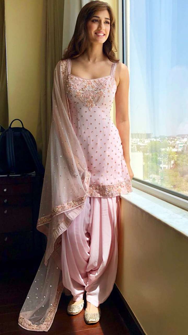 आप दिशा के इस बेबी पिंक सलवार कट स्लीव्स कुर्ती को पेयर कर सकती हैं। ये आपको बेहद क्लासी लुक देगा।