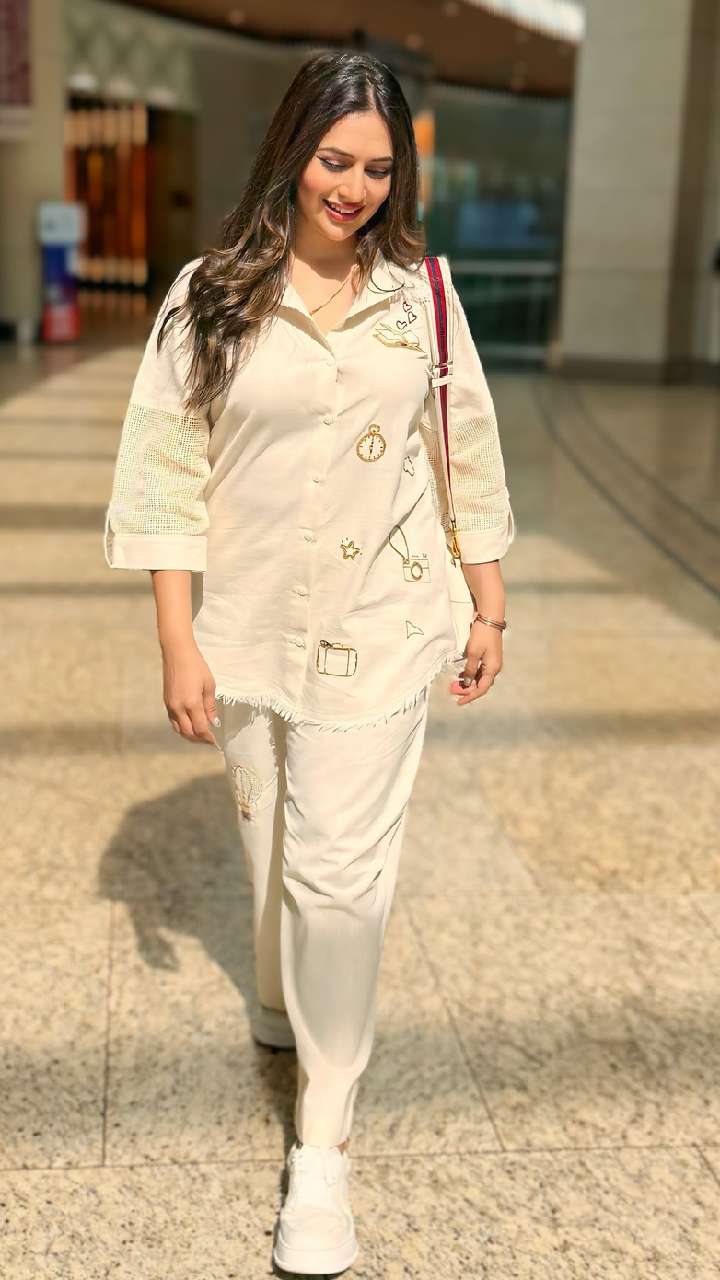ऑफिस में स्टाइलिश और गॉर्जियस लुक लेने के लिए एक्ट्रेस का यह कॉटन को- ऑर्ड सेट एकदम परफेक्ट ऑप्शन है। आप लुक को अट्रैक्टिव बनाने के लिए डार्क न्यूड मेकअप ट्राई कर सकती हैं।