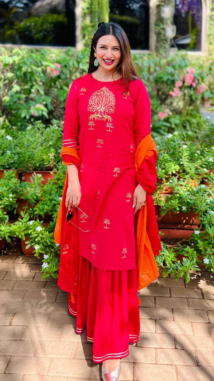 दिव्यांका रेड कलर के शरारा सूट सेट बेहद खूबसूरत लग रही हैं। शादीशुदा इसे ऑफिस में स्टाइल करके जलवा दिखा सकती हैं।