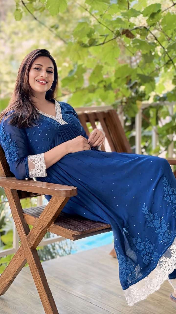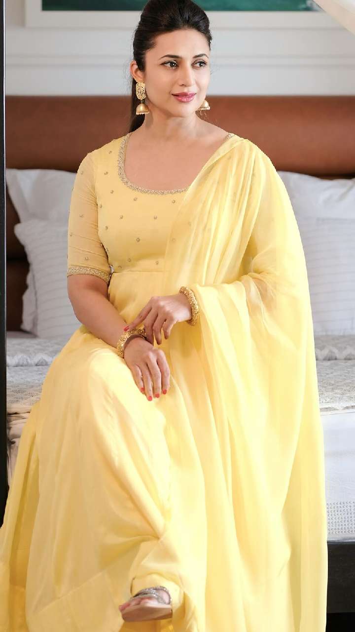 आप इस तरह के सिंपल येलो अनारकली सूट को भी कैरी कर सकती हैं। दिव्यांका त्रिपाठी का फैशन सेंस बेहद शानदार है।