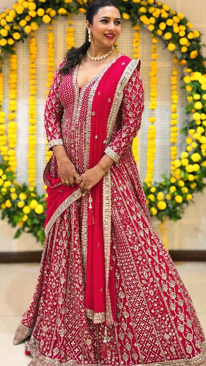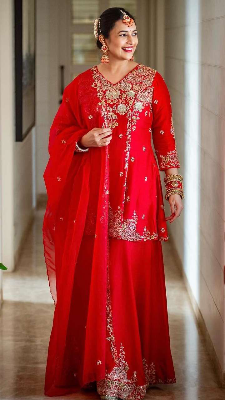 एक्ट्रेस ने रेड कलर का जरी वर्क अनारकली सूट पहना है। इस तरह के सूट नई दुल्हन घर के पूजा-पाठ में स्टाइल कर सकती हैं।