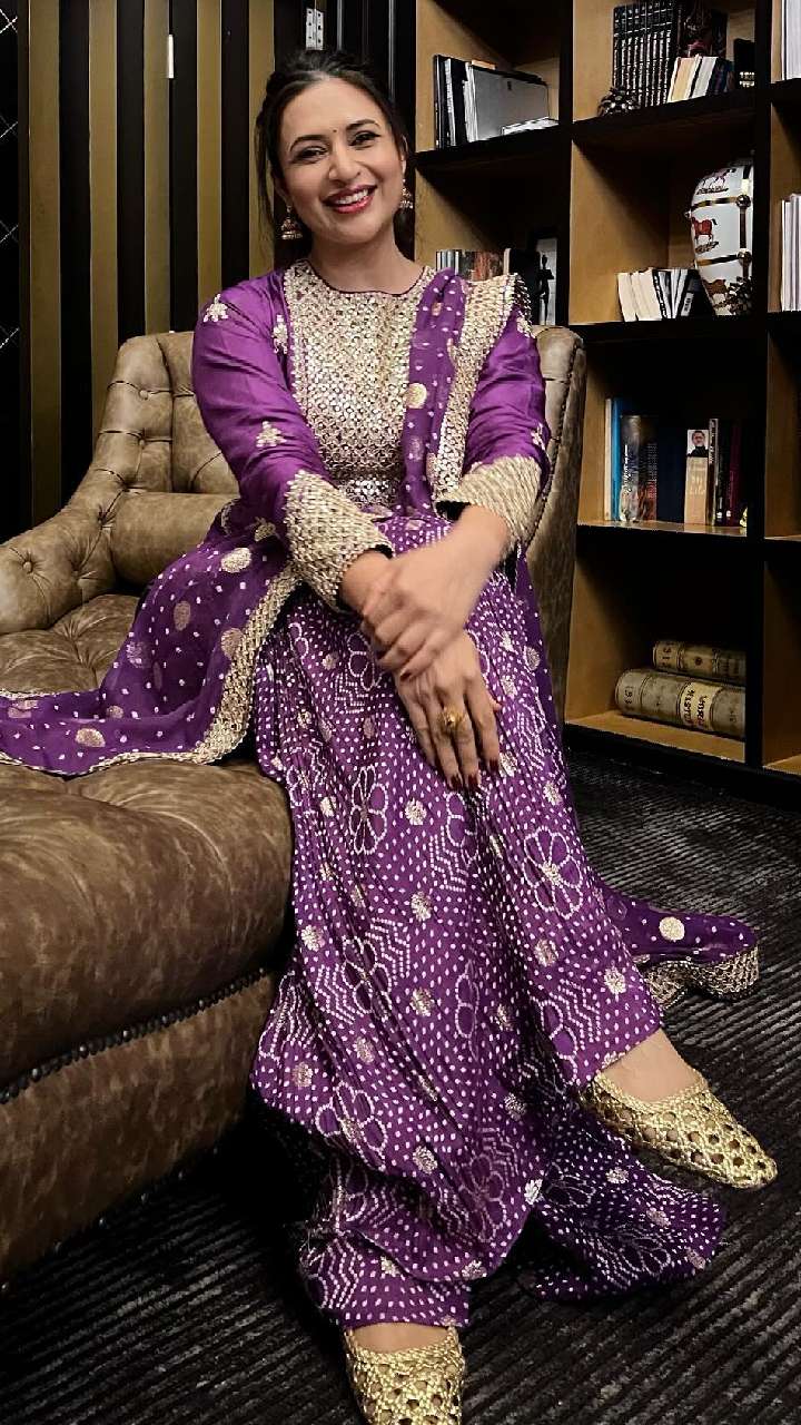 पर्पल कलर के सलवार सूट में दिव्यांका बेहद खूबसूरत लग रही हैं। ऐसे सूट लुक को शानदार बना देता है। आप भी उनके इस लुक को कॉपी कर सकती हैं।