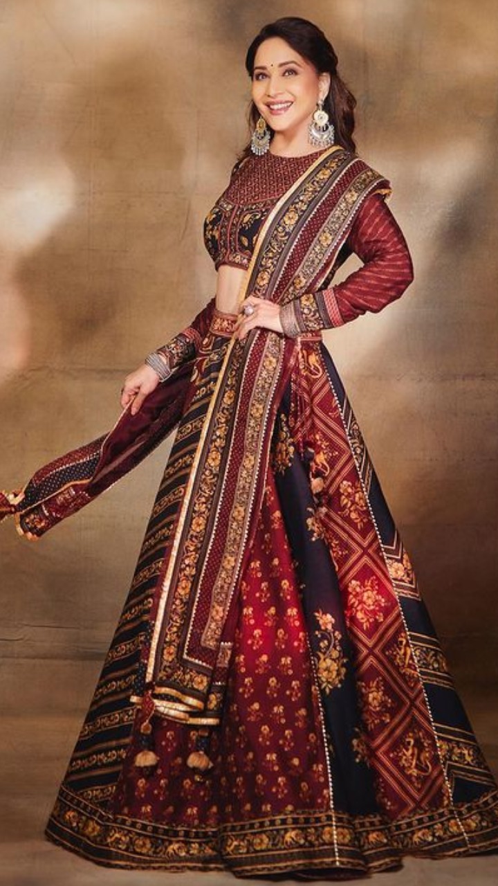 बरगंडी कलर के लहंगे में माधुरी किसी एंजल से कम नहीं लग रही हैं। उनके ये ट्रेडिशनल कलेक्शन लोगों को काफी पसंद आते हैं।