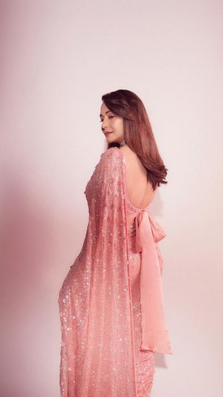 माधुरी अपनी प्राकृतिक सुंदरता से लोगों को अचंभित कर रही हैं। तस्वीर में एक्ट्रेस ने प्रिटेंड गुलाबी रंग की साड़ी पहनी हुई हैं।