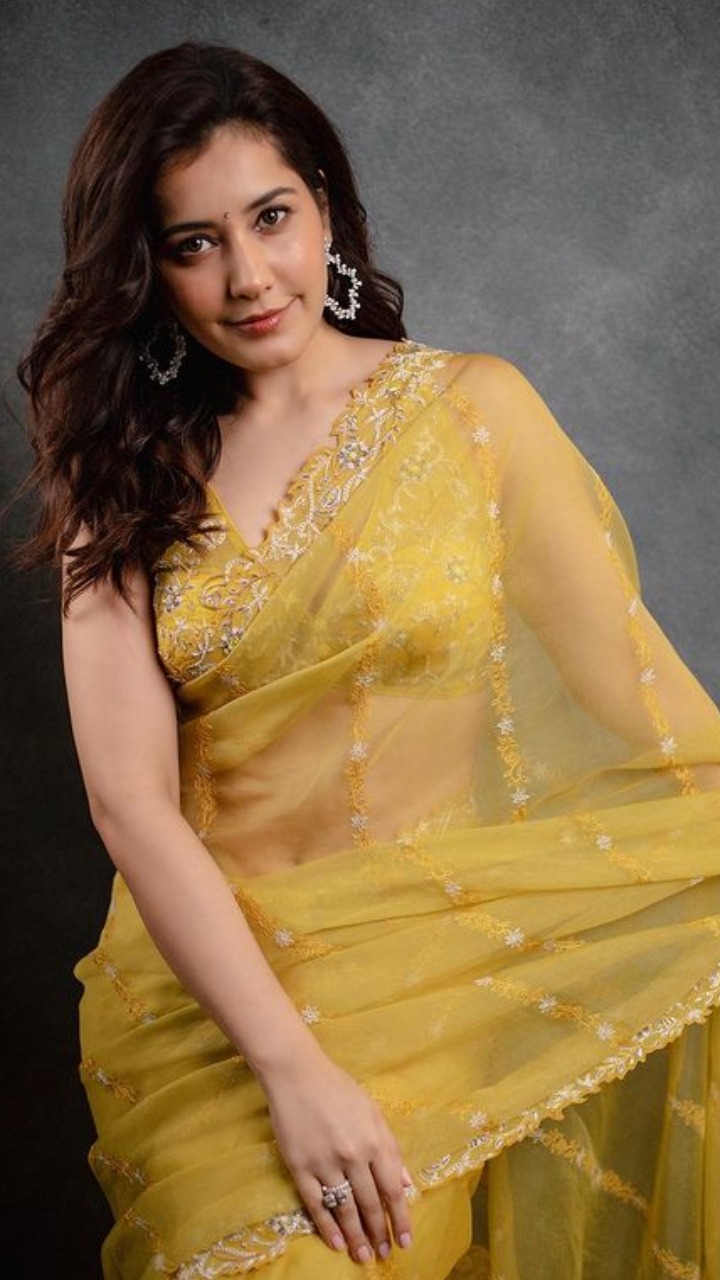 तस्वीर में एक्ट्रेस ने येलो कलर की थ्रेड एंब्रॉयडरी वाली साड़ी और झुमके पहने हुए हैं। राशि का ये शानदार स्टाइल त्योहारों के लिए परफेक्ट हैं।
