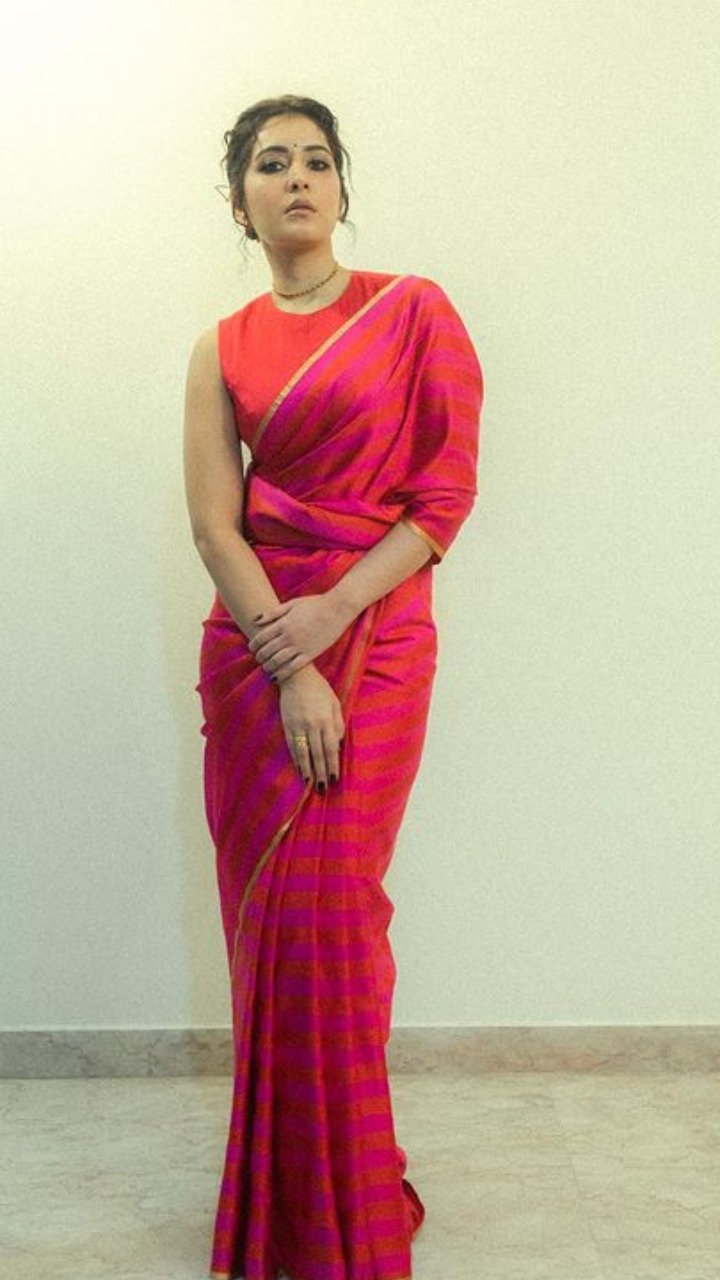 राशि को एथनिक ड्रेसेज काफी पसंद हैं, पिंक साड़ी और ऑरेंज कलर की स्लीवलेस बोट नेक ब्लाउज में एक्ट्रेस बेहद खूबसूरत लग रहा हैं।