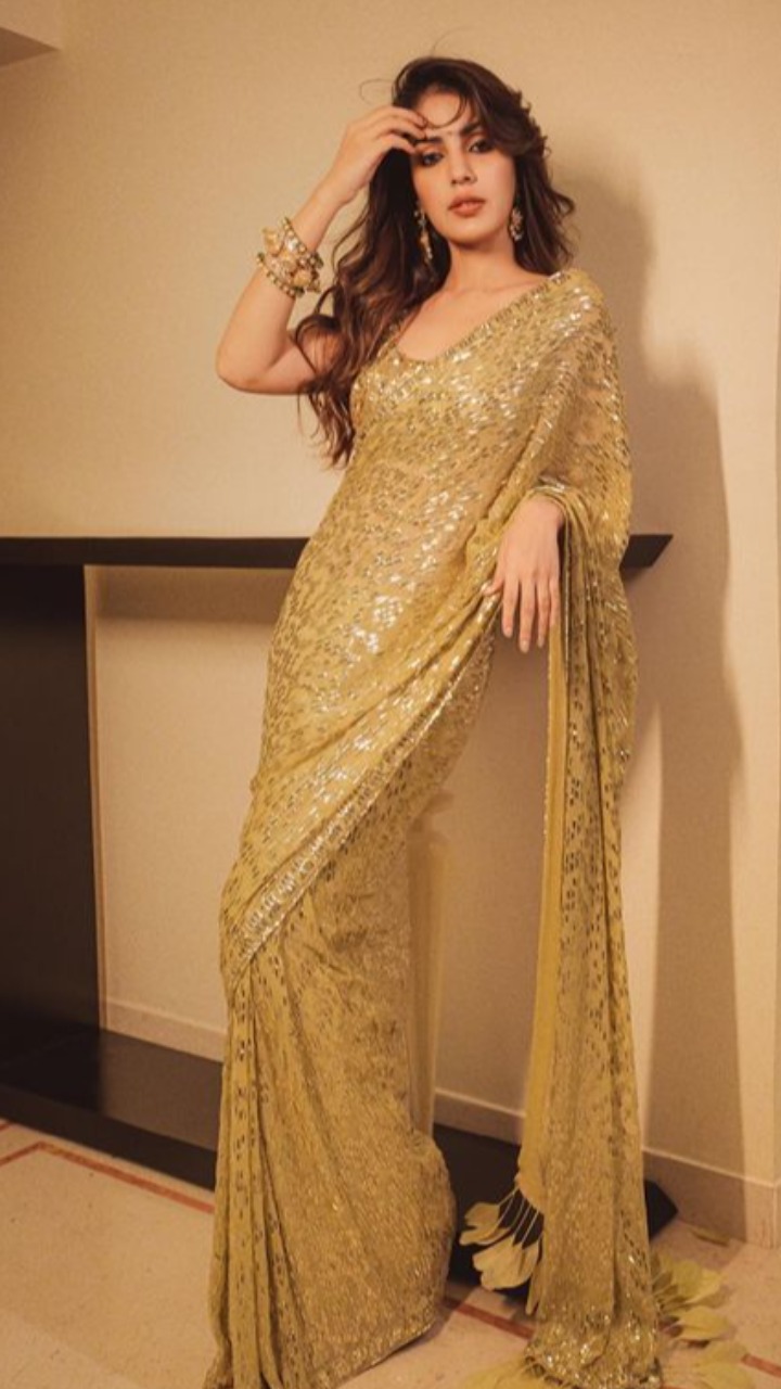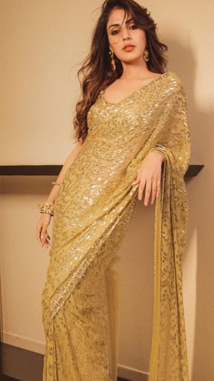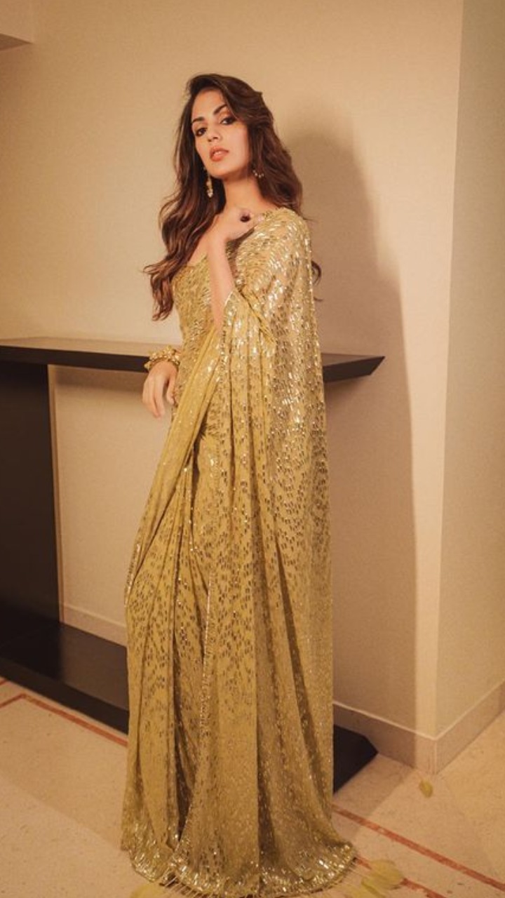 रिया चाक्रवार्ती गोल्डन शिमरी साड़ी में बला की खूबसूरत लग रही हैं।