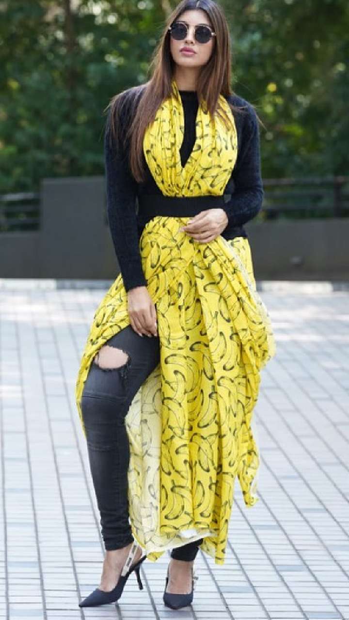 टीनेज गर्ल्स एक्ट्रेस के इस इंडो-वेस्टर्न साड़ी लुक से इंस्पिरेशन ले सकती हैं। एक्ट्रेस ने इस प्रिंटेड येलो साड़ी को बेल्ट और जींस के साथ पेयर किया है।