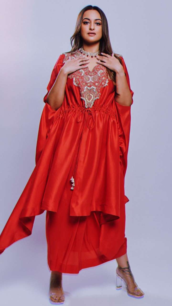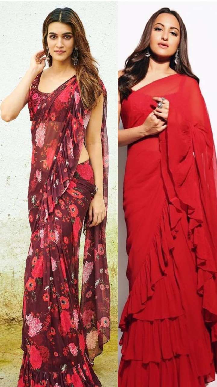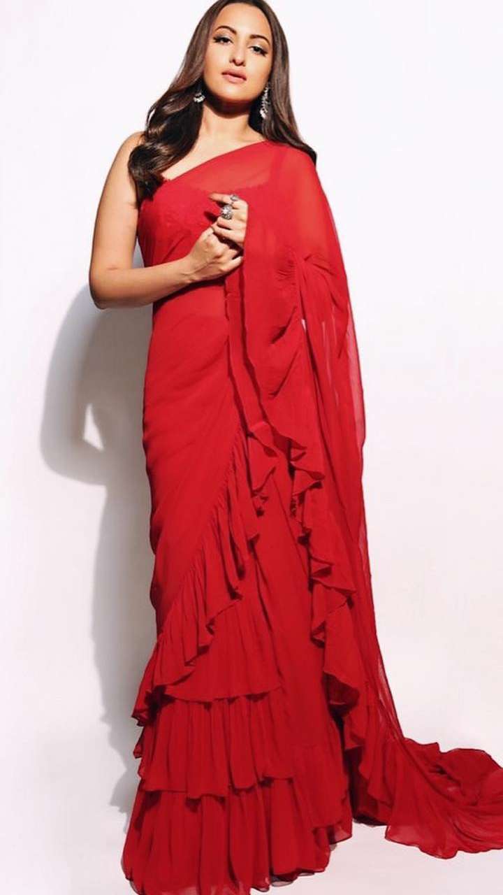 अगर आप अपने लुक को सिंपल सोबर रखना चाहती हैं तो सोनाक्षी सिन्हा का ये सिंपल रेड रफल साड़ी लुक कैरी करें।
