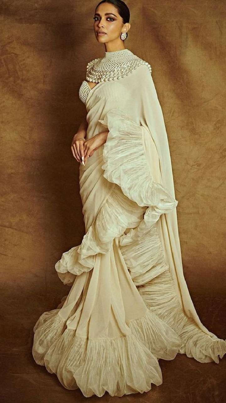 दीपिका पादुकोण का ये व्हाइट रफल साड़ी लुक काफी ज्यादा रॉयल लग रहा है। इस साड़ी के साथ एक्ट्रेस ने पर्ल का ब्लाउज कैरी किया है।