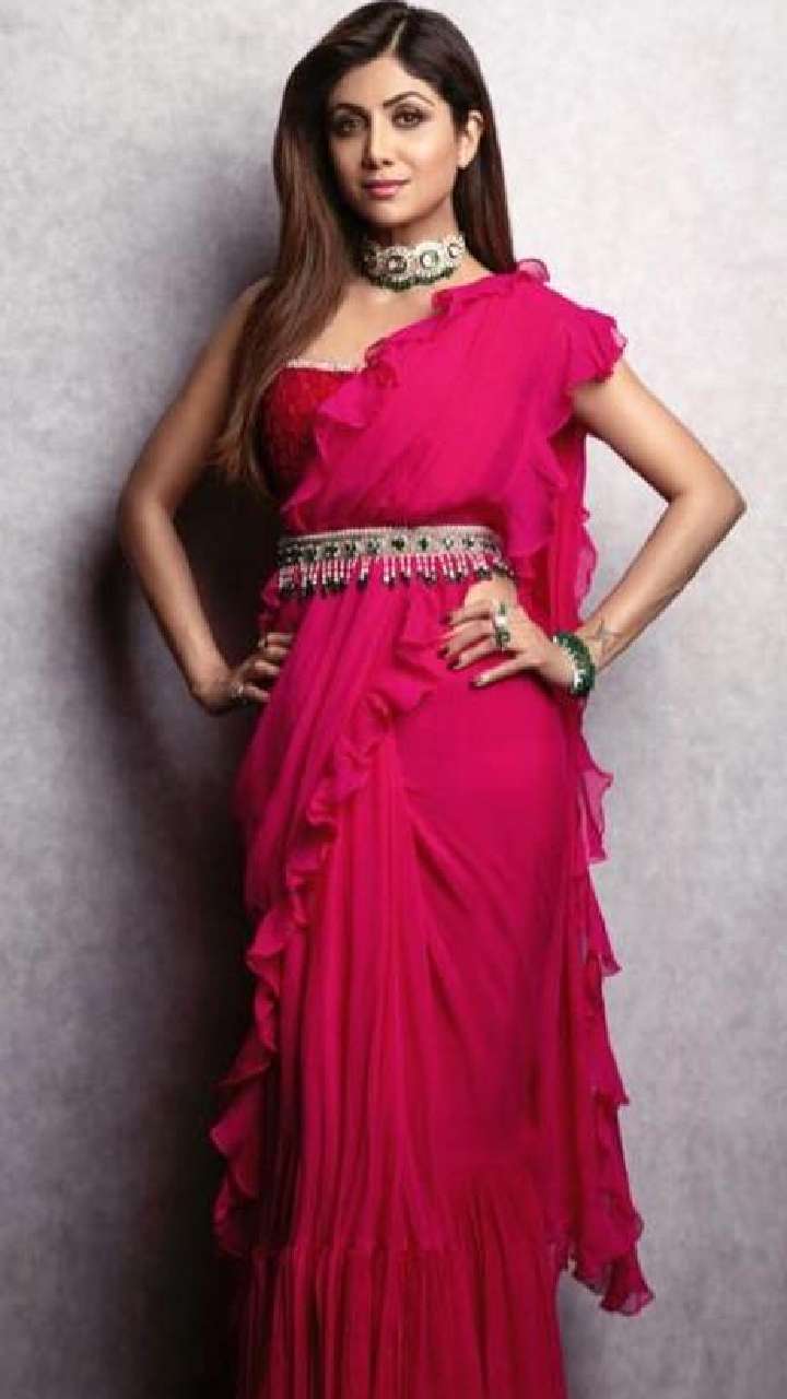 शिल्पा शेट्टी के पास साड़ी का शानदार कलेक्शन है। पिंक कलर की रफल साड़ी लुक को एक्ट्रेस ने बेल्ट के साथ पेयर किया है।