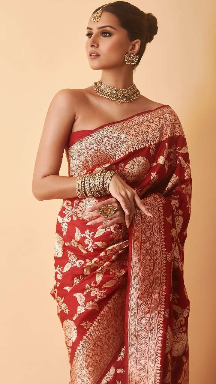 रेड कलर की साड़ी में तारा सुतारिया काफी ज्यादा हॉट लग रहीं हैं। एक्ट्रेस ने इस साड़ी के साथ ट्यूब ब्लाउज कैरी किया है।