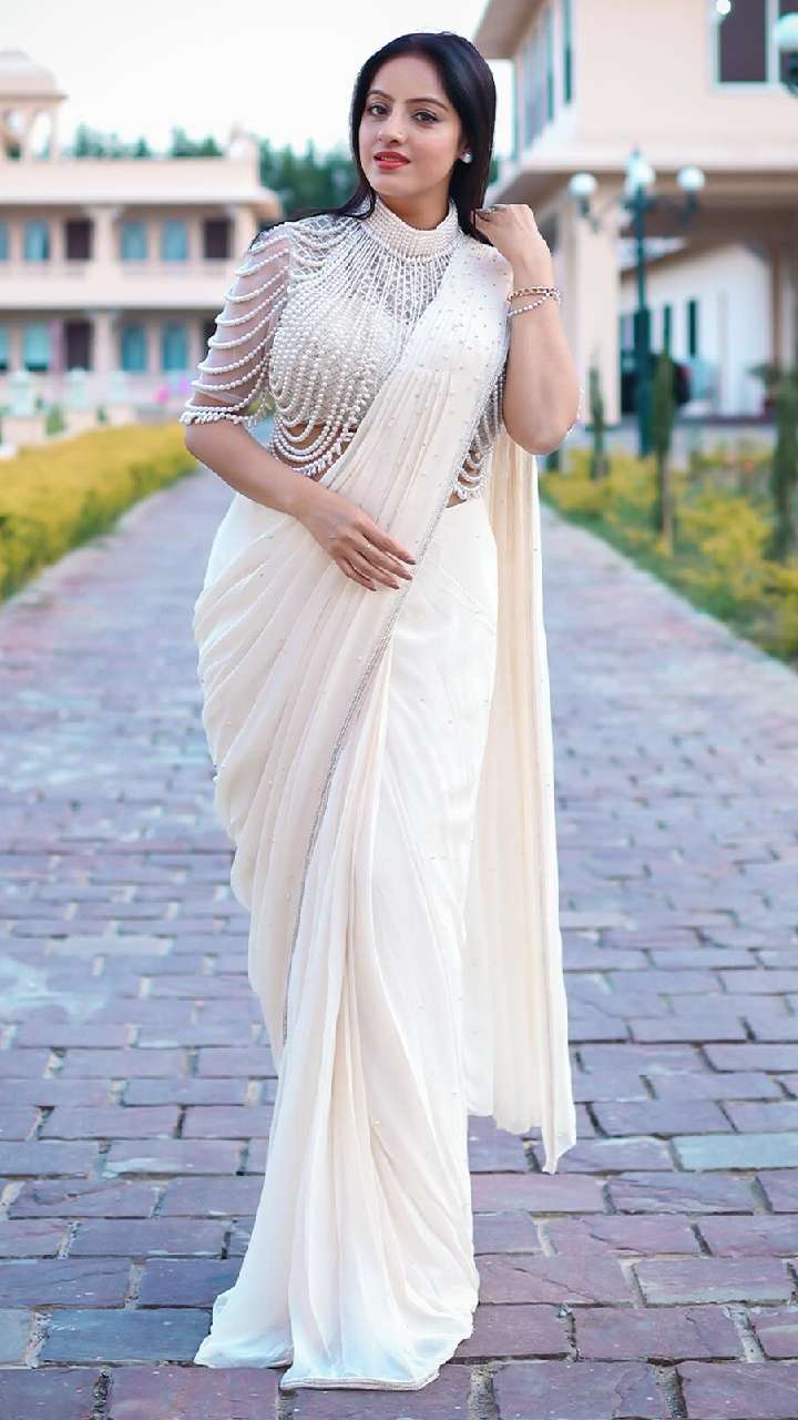 दीपिका सिंह ने व्हाइट कलर की प्लेन साड़ी के साथ पर्ल ब्लाउज कैरी किया है, जिसमें वह बला की खूबसूरत लग रही हैं। आप भी उनके इस लुक को रीक्रिएट करें।