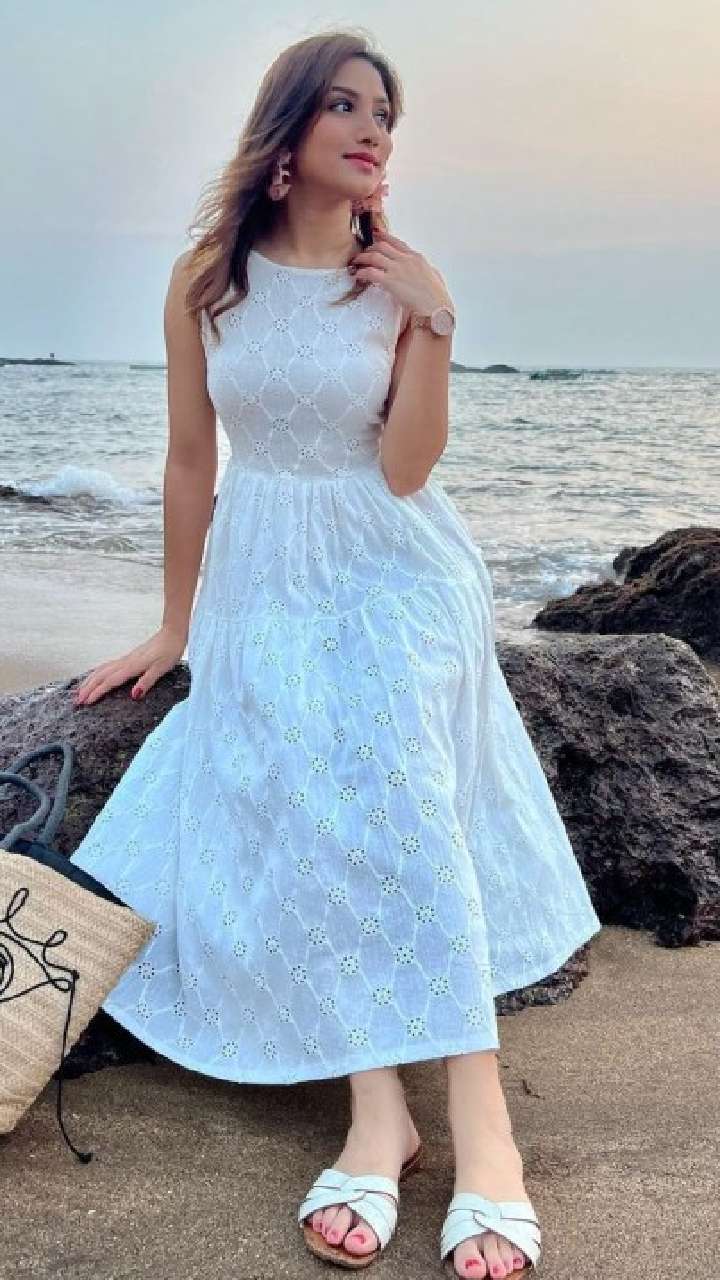 बिग बॉस 15 कंटेस्टेंट बीच पर व्हाइट कलर का मैक्सी ड्रेस पहने बेहद खूबसूरत अदाएं देती नजर आ रही हैं।