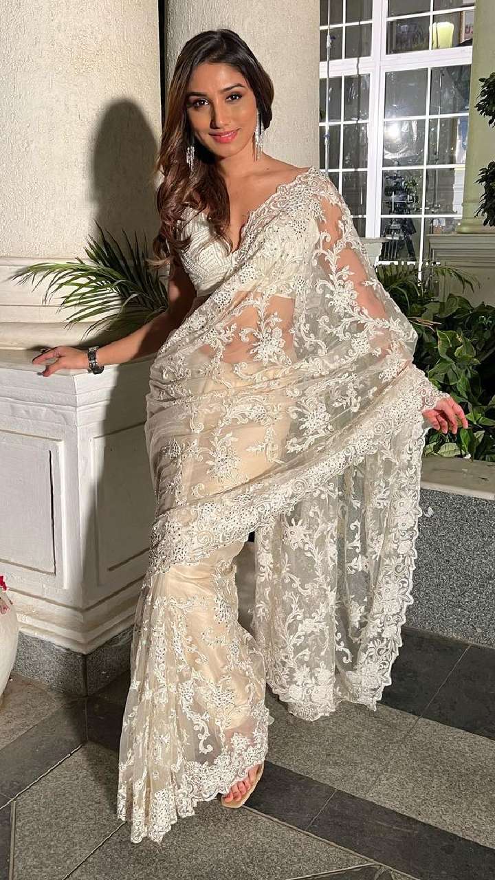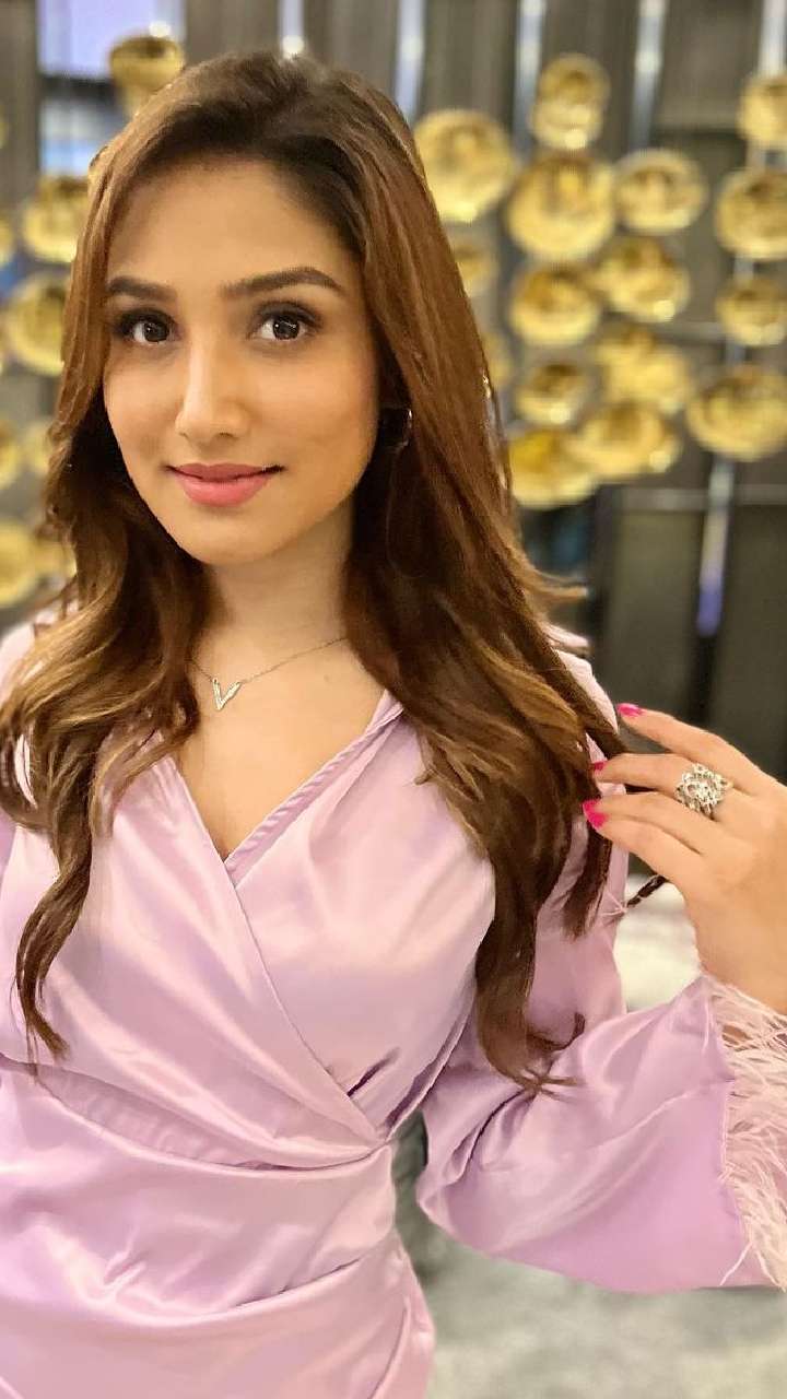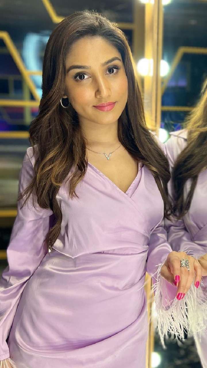 तस्वीर में एक्ट्रेस ने सिल्क कपड़े में लिलेक कलर का फेदर शॉर्ट ड्रेस पहना हुआ है।