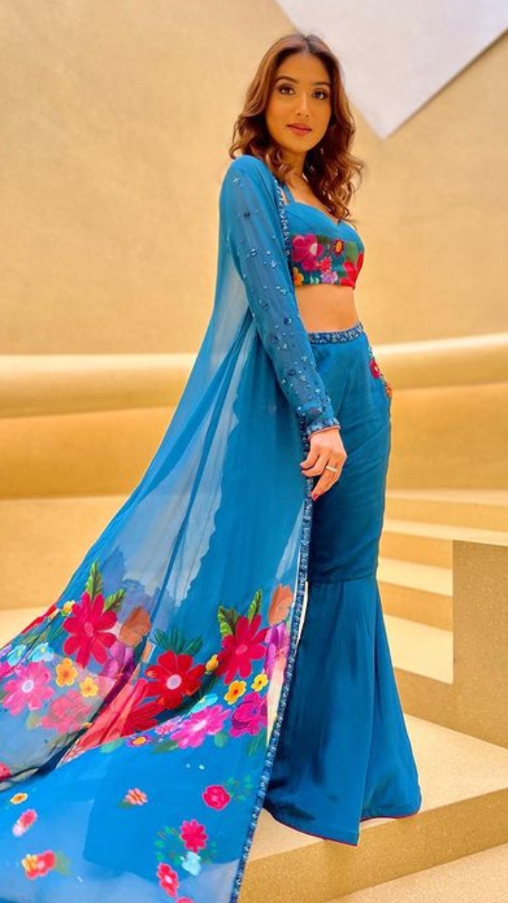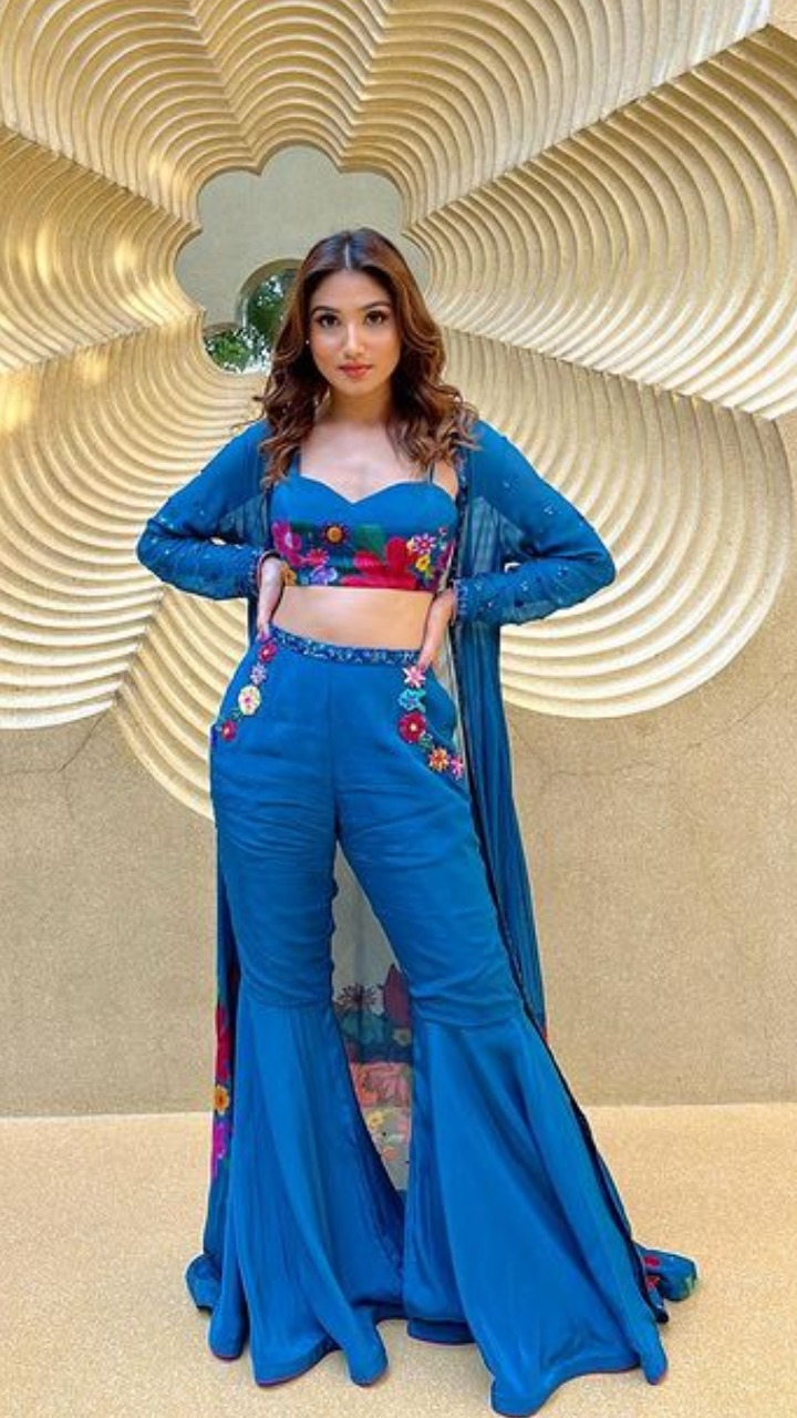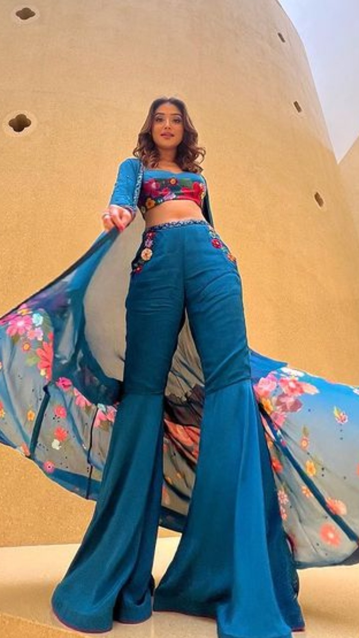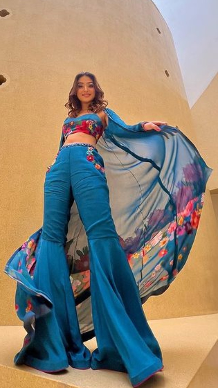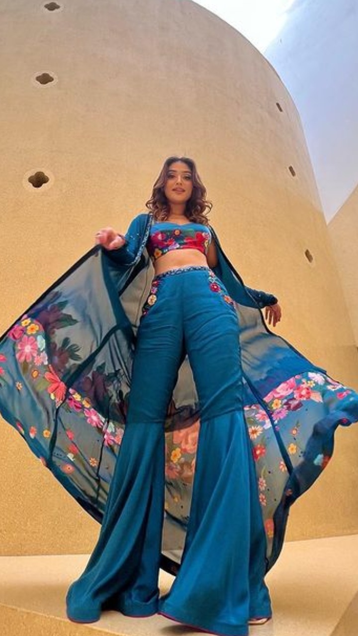 तस्वीर में एक्ट्रेस ने ब्लू कलर का फ्लोरल प्रिंटेड क्रॉप टॉप और लॉन्ग श्रग पहना हुआ है।