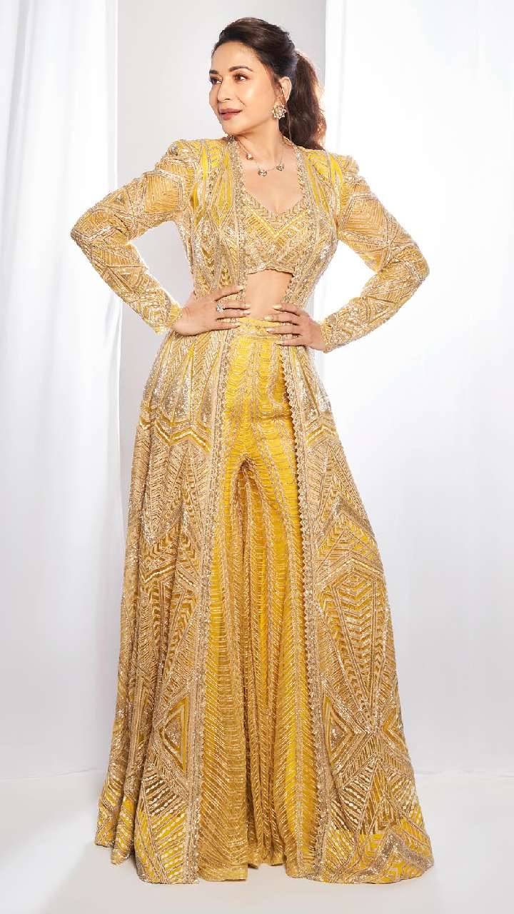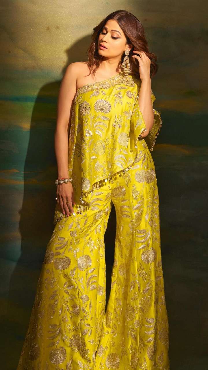 एक्ट्रेस का यह डिजाइन को-ऑर्ड सेट आपके लिए एकदम परफेक्ट ऑप्शन है। लुक कंप्लीट करने के लिए आप मेसी बन हेयर स्टाइल ट्राई कर सकती हैं।