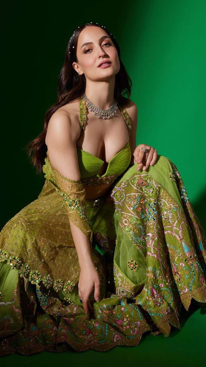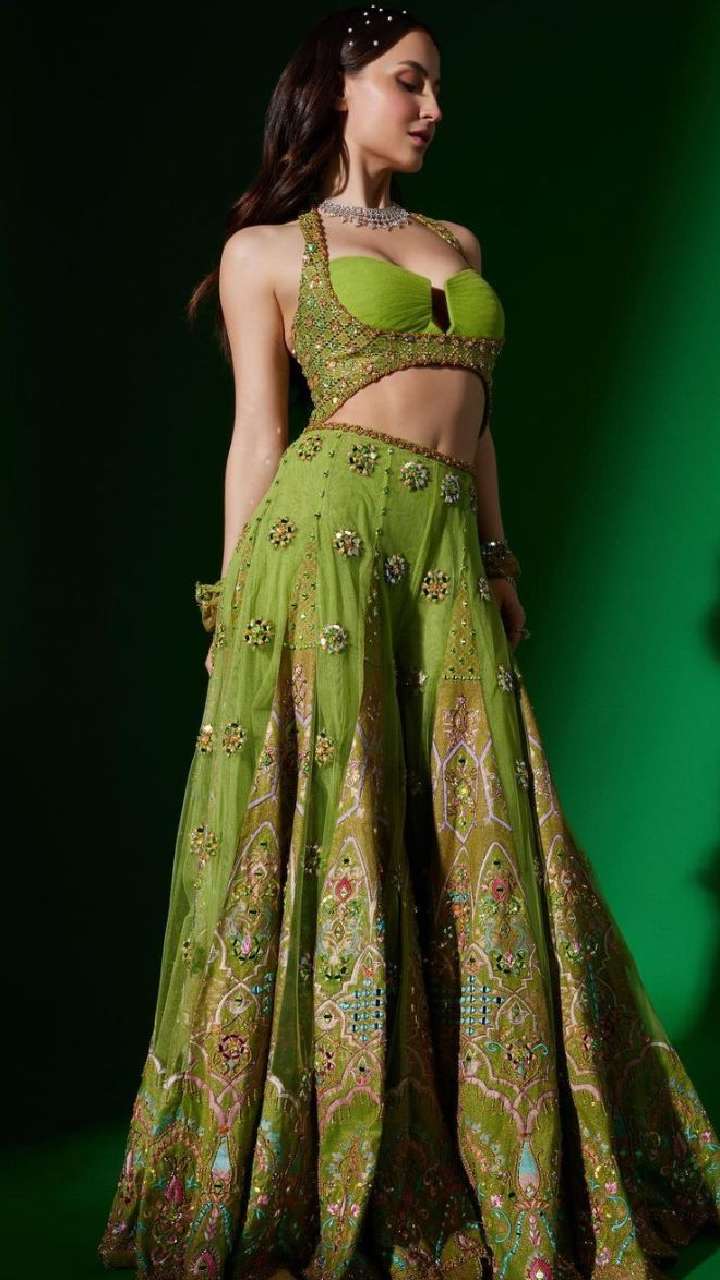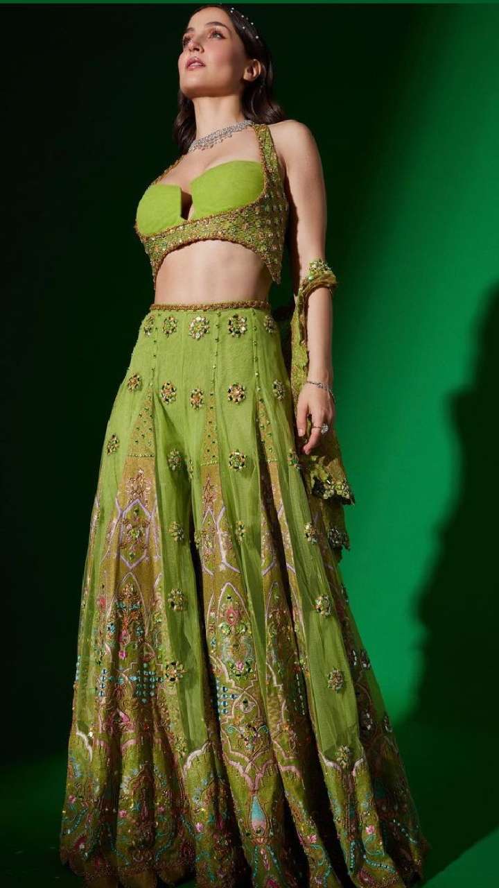 तस्वीर में एक्ट्रेस ने ग्रीन कलर का लहंगा और स्लीवलेस ब्लाउज पहना हुआ है।