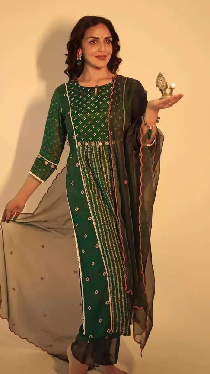 अभिनेत्री का ग्रीन गोल्डन प्रिंट वाला प्लाजो सूट गॉर्जियस लुक दे रहा है। ये आपके नवरात्र लुक में चार चांद लगा देगा। पूजा में हरा रंग पहनना अच्छा होता है।