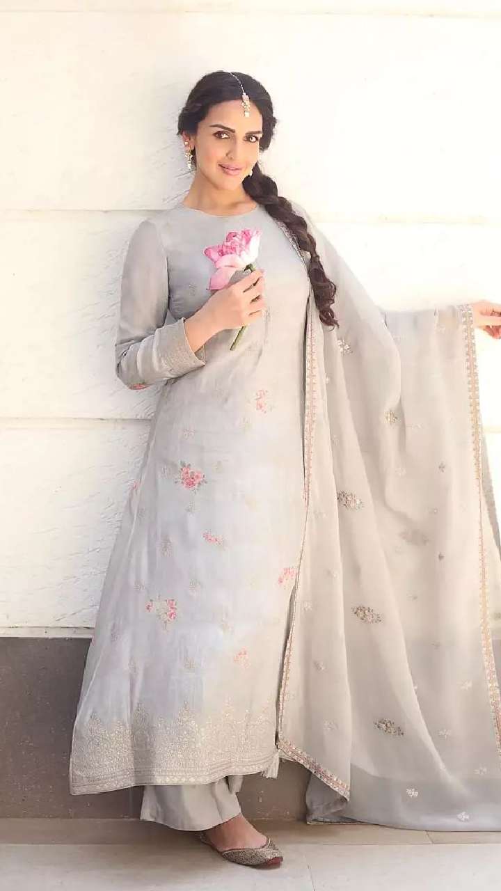 एक्ट्रेस का ए लाइन ग्रे सूट काफी ब्यूटीफुल लुक दे रहा है। इसको आप नवरात्रि के मौके पर पहनकर मंदिर पहनकर जा सकती हैं।