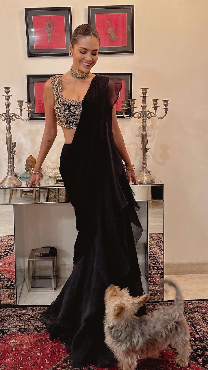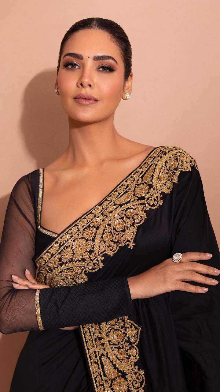 ईशा गुप्ता की इस ब्लैक साड़ी में गोल्डन बॉर्डर साड़ी लुक को खास बना रही है। आप भी इस तरह के लुक को कैरी कर सकती हैं।
