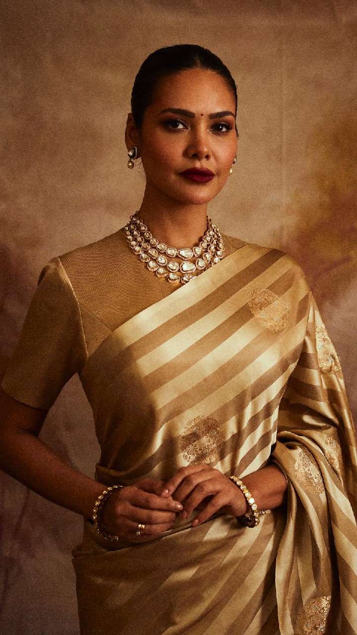 अगर आप अपने इंडियन लुक को रॉयल बनाना चाहती हैं तो आप इस तरह की गोल्डन साड़ी को कैरी कर सकती हैं।
