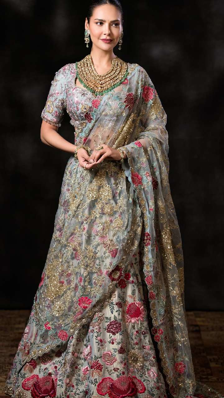 Esha इस तस्वीर में एकदम रानी जैसी लग रही हैं। एक्ट्रेस ने टाइट बन हेयर स्टाइल और हैवी नेकलेस के साथ लहंगे को बड़ी खूबसूरती से स्टाइल किया है।