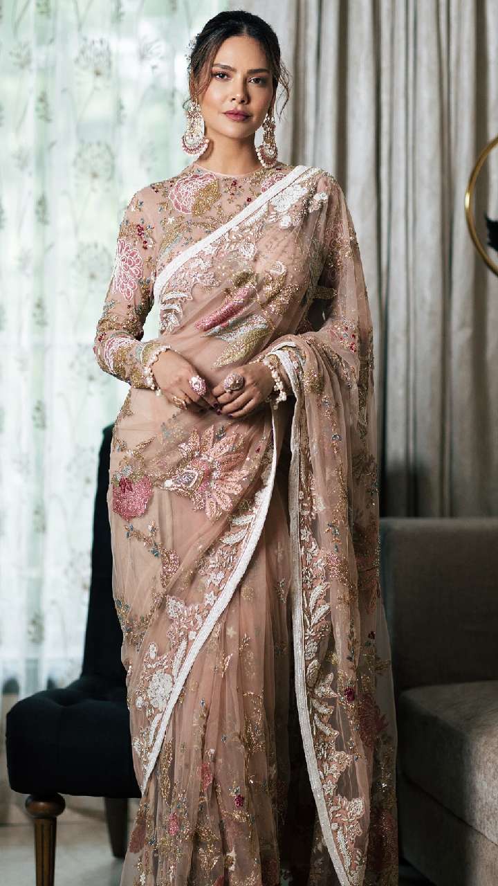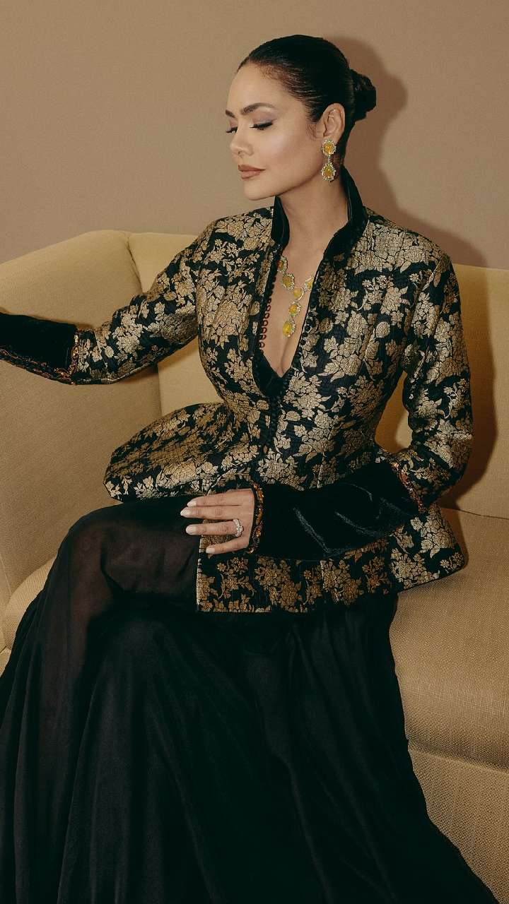 लॉन्ग डिजाइनर ड्रेस के साथ एंब्रॉयडरी वाला ब्लेजर एक्ट्रेस के लुक को रॉयल बना रहा है। साथ ही, डार्क मेकअप ईशा के स्टाइल को दूर से हाइलाइट करने का काम करेगा।
