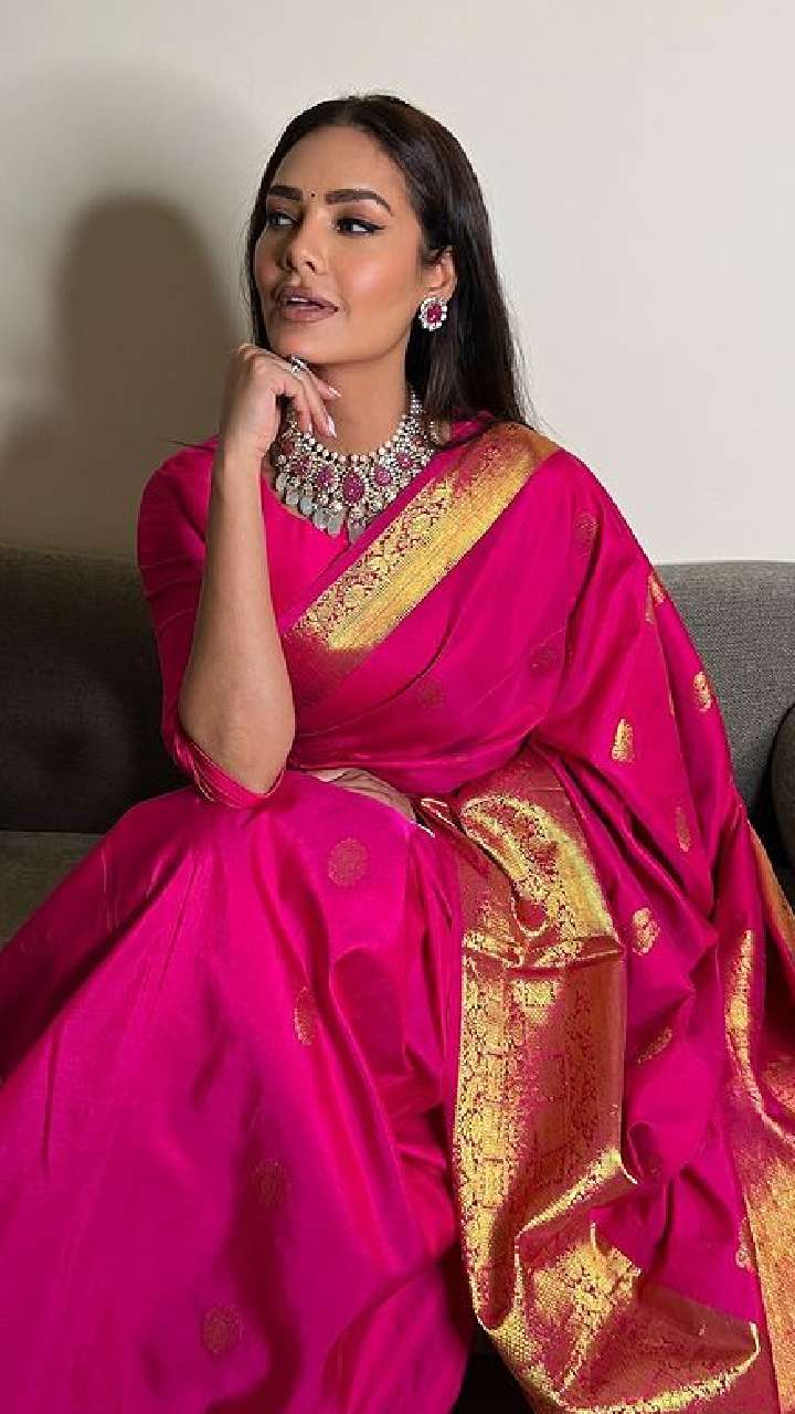 अभिनेत्री इस मेजेंटा पिंक कलर की बनारसी साड़ी में बेहद खूबसूरत लग रही हैं।